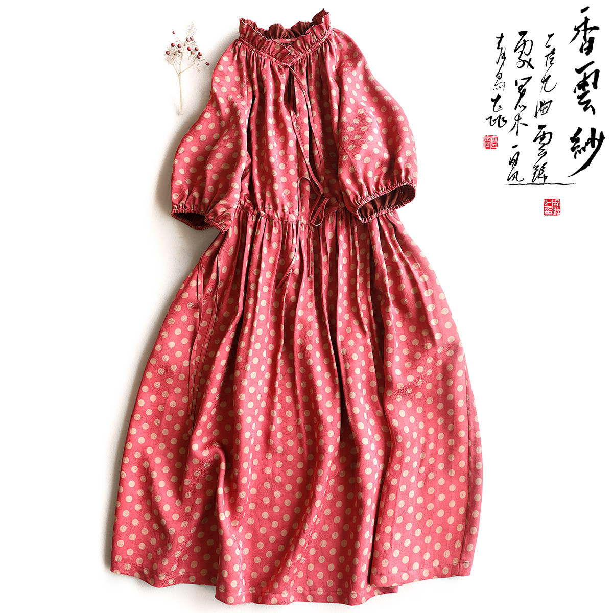 Yunshu original floral fragrance cloud gauze French vintage polka dot swing dress summer fungus collar mulberry silk skirt