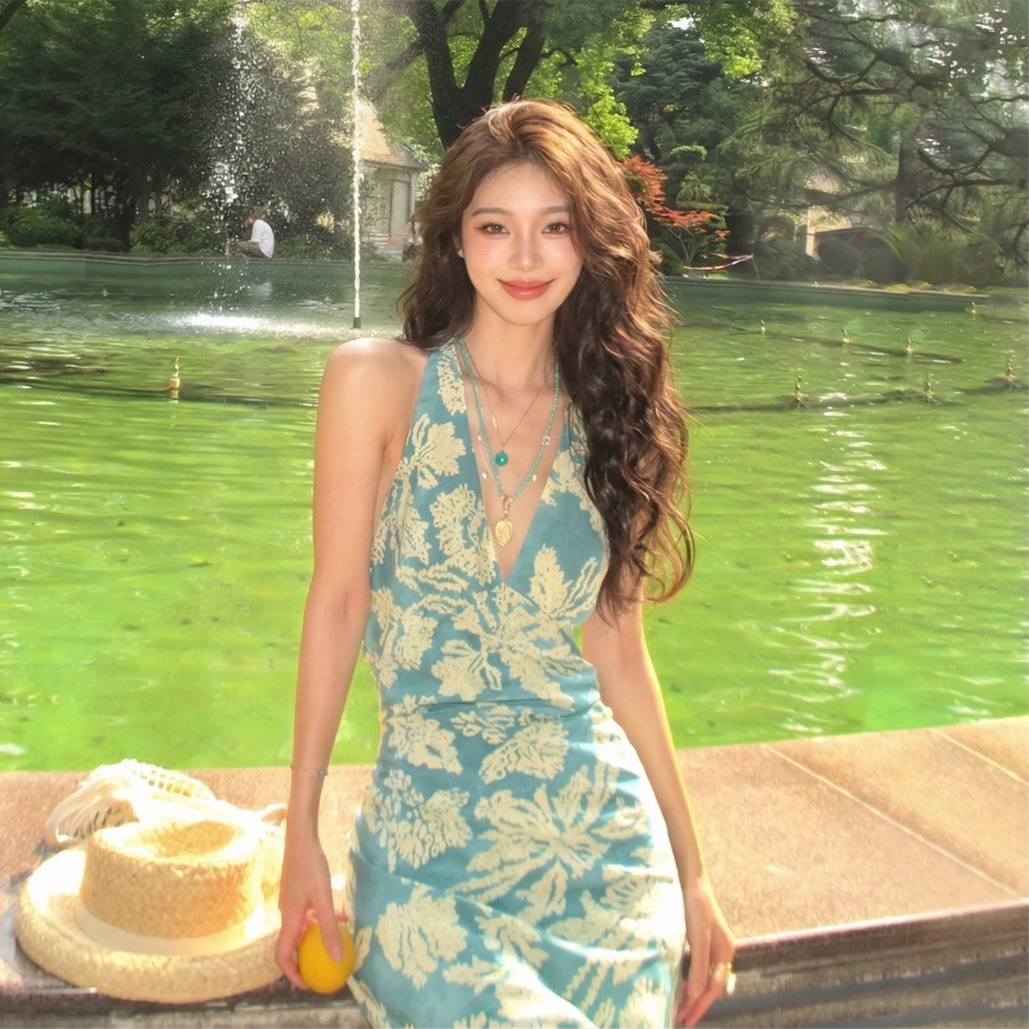 Yang Kaiwen's peacock blue V-neck floral halter neck camisole dress women's summer southern French resort style backless long skirt