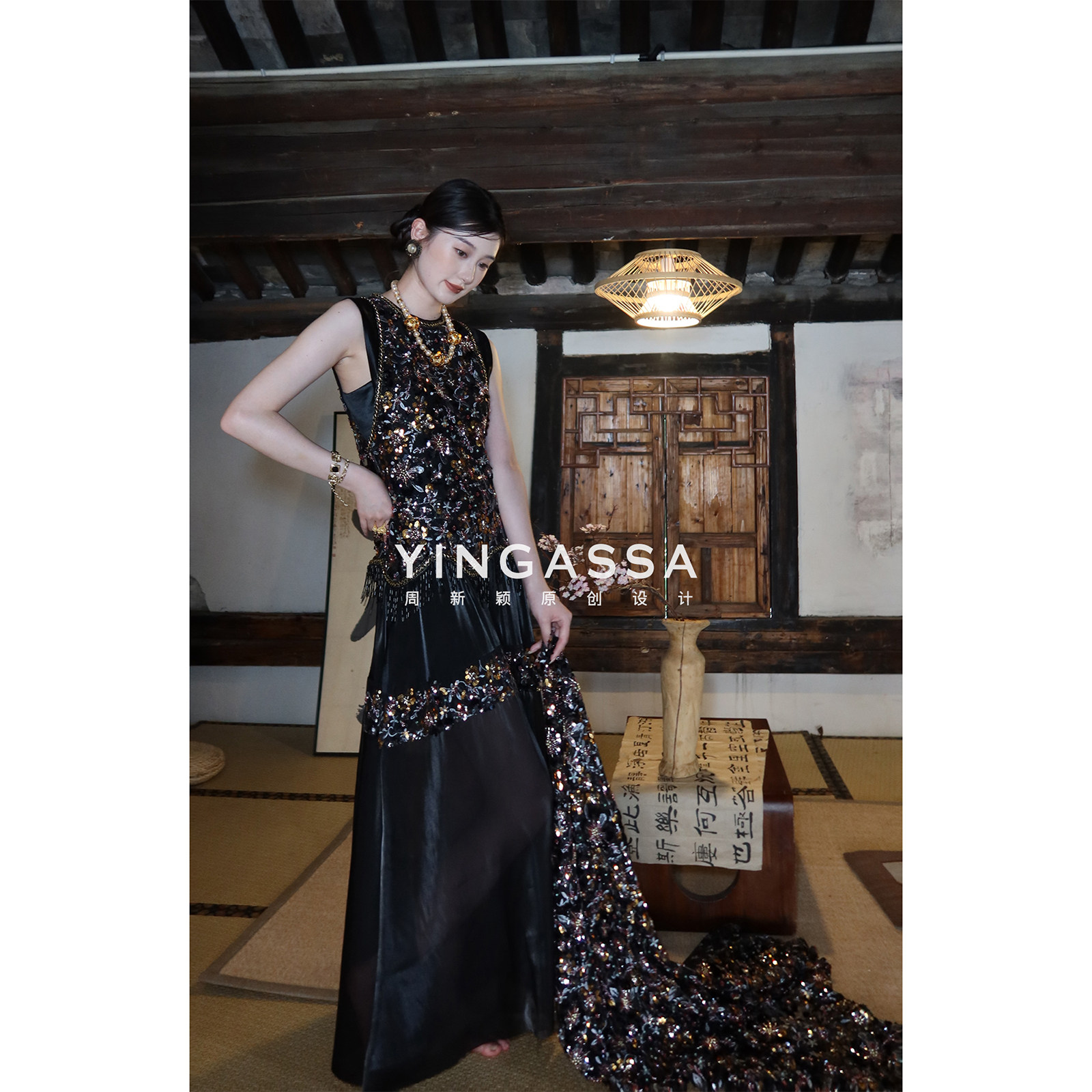Zhou Xinxin YINGASSA [Flower of the Night] summer ceiling three-dimensional black beaded embroidered national style dress