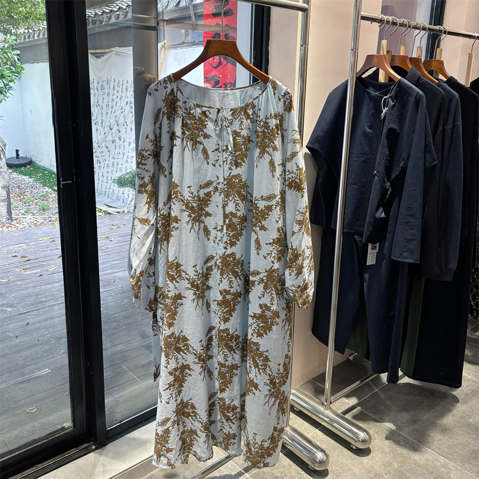 Spring Dawn Design V-neck linen cotton print long sleeve loose dress resort style long skirt