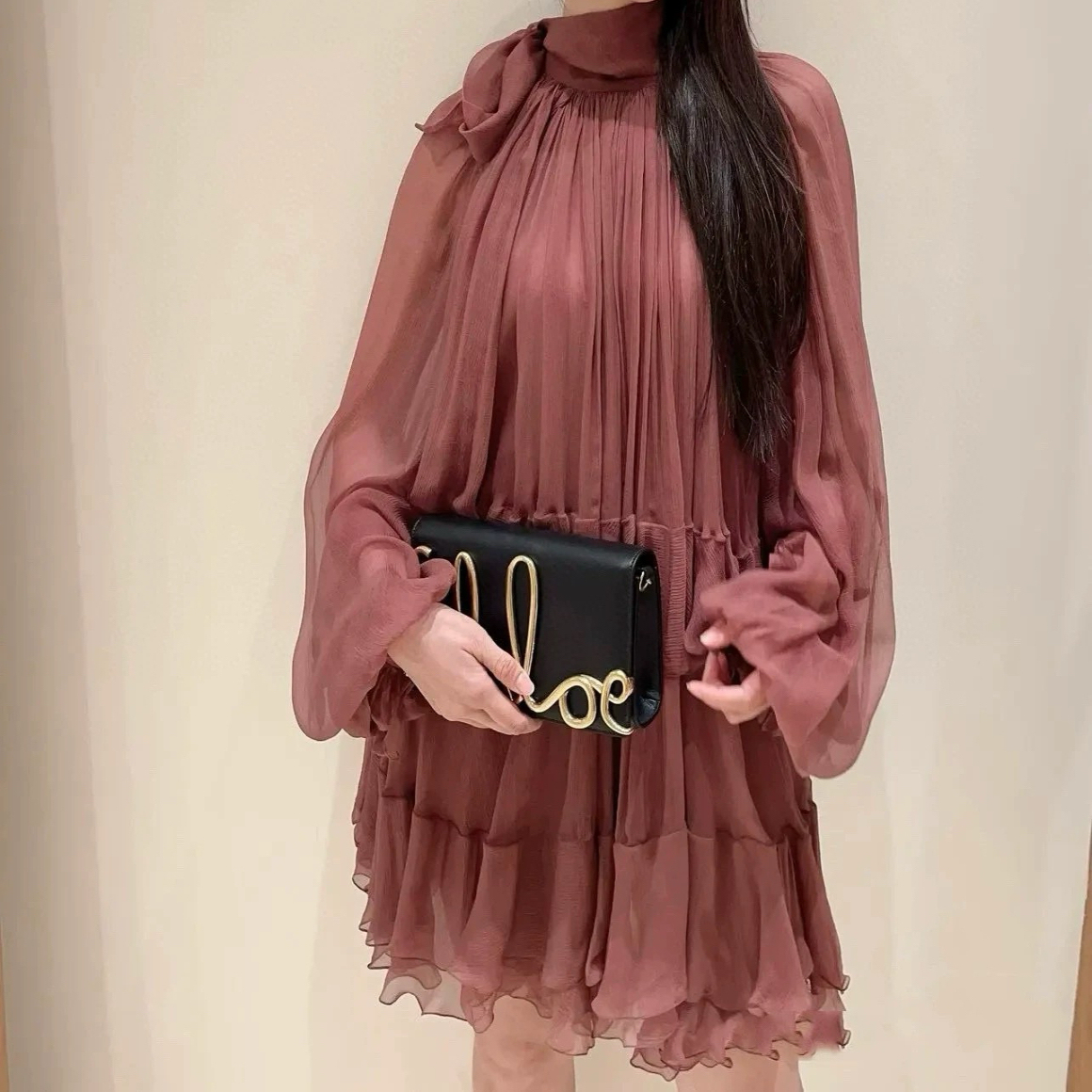 French aesthetics feminine GAO grade orange pink/wood rose color smooth silk dress