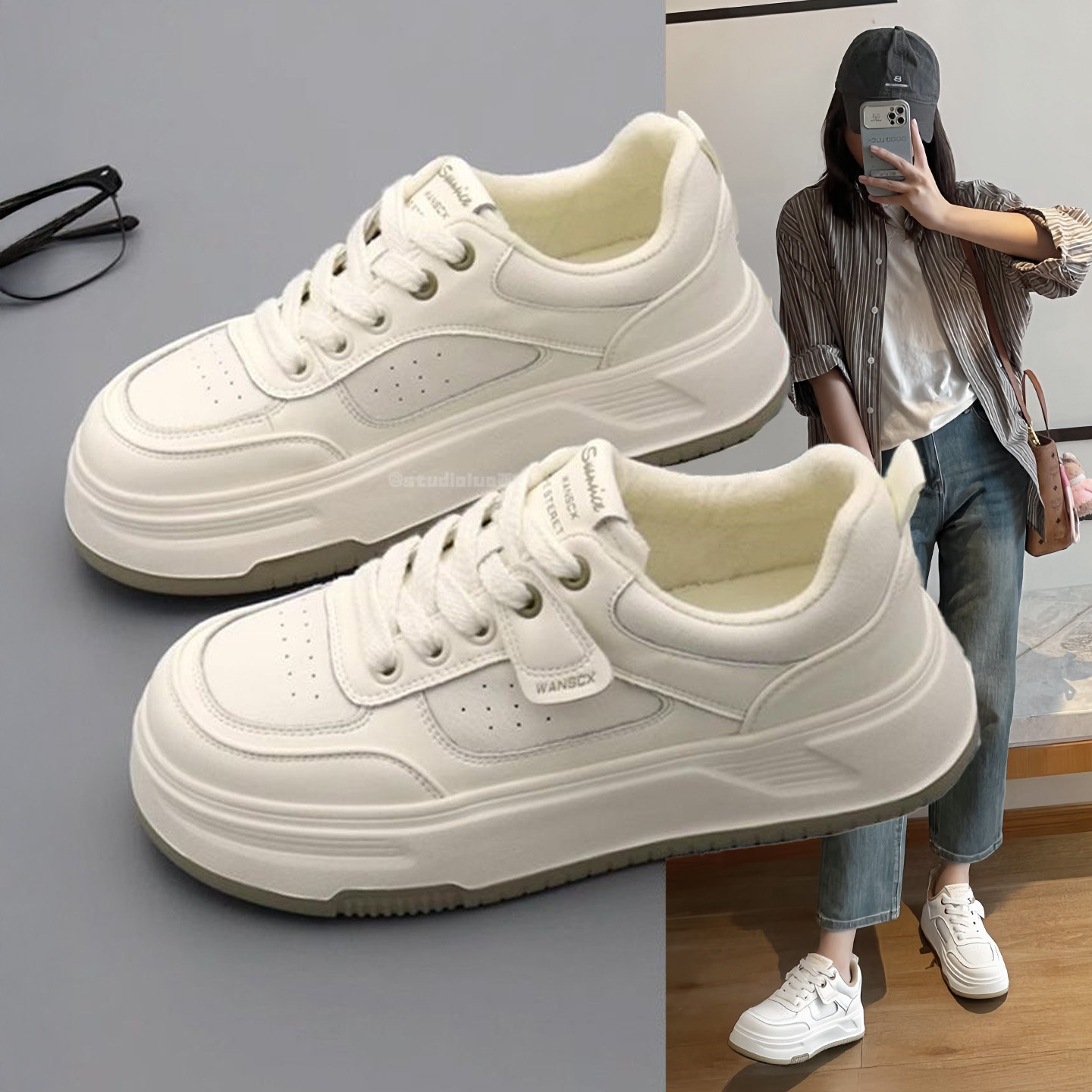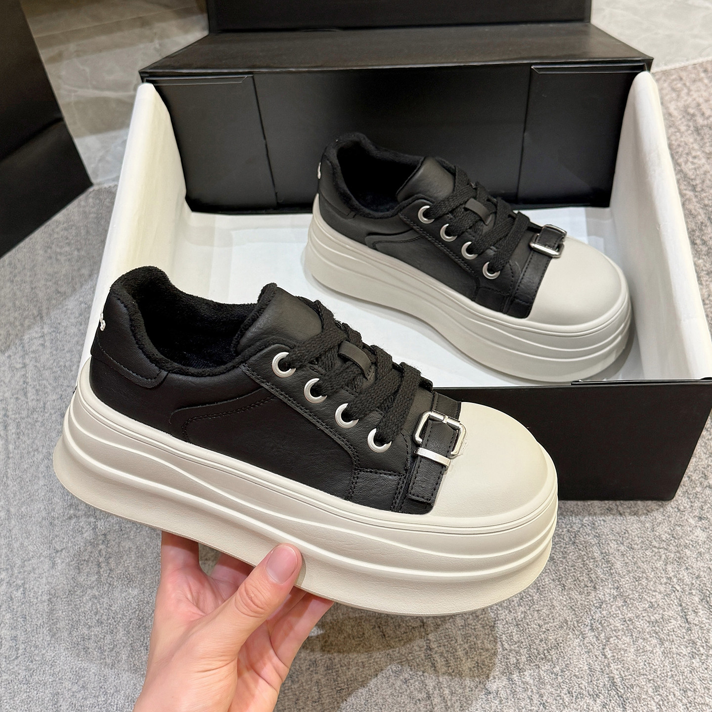 Hong Kong leather platform sole heightening pop crack casual board shoes women's 2025 spring and autumn fleece white shoes fashion sneakers