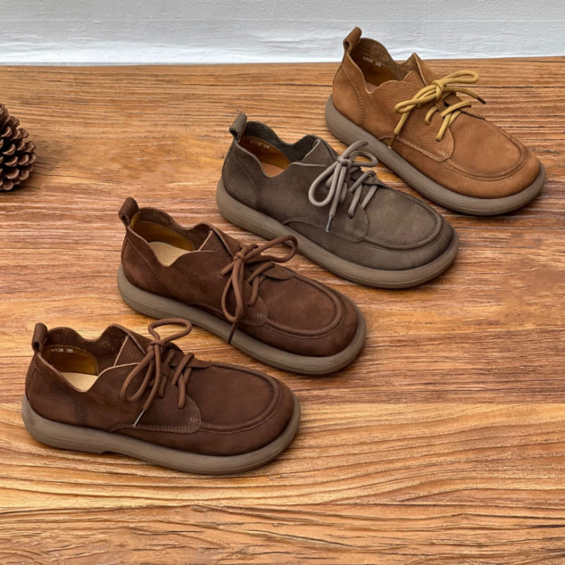 Literary handmade leather women's shoes 2026 autumn retro round toe flat heel soft sole casual versatile lace-up cowhide single boots