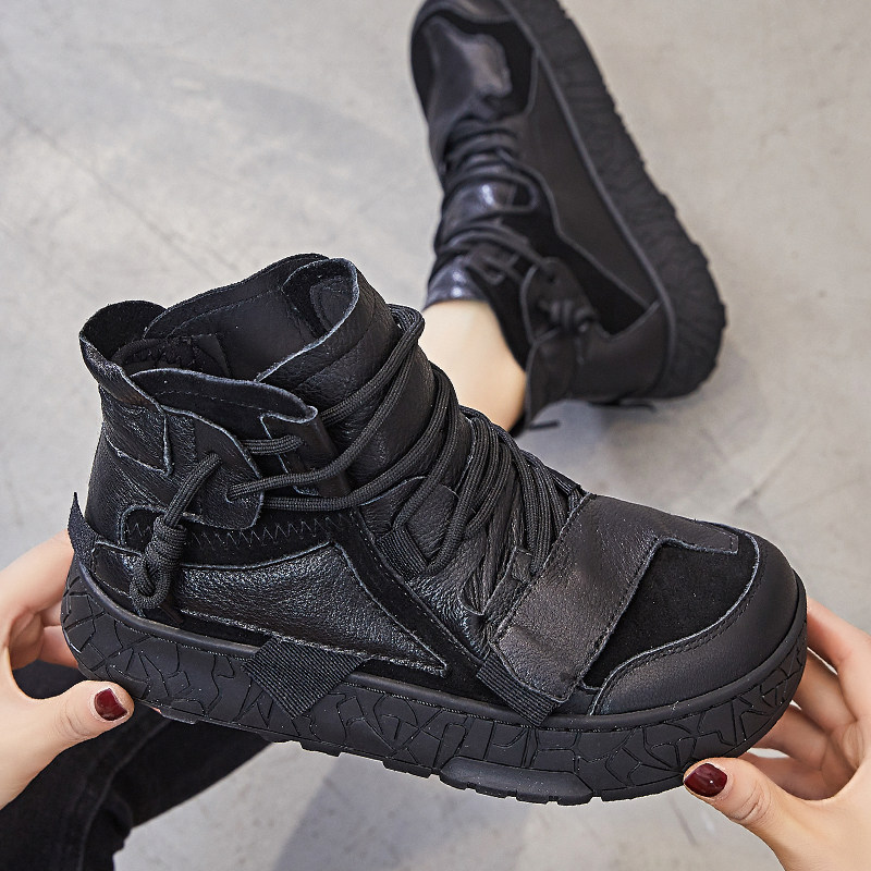 CCVV high-top ugly cute shoes girl 2025 spring and autumn leather muffin thick-soled leather casual board shoes lace-up shoes