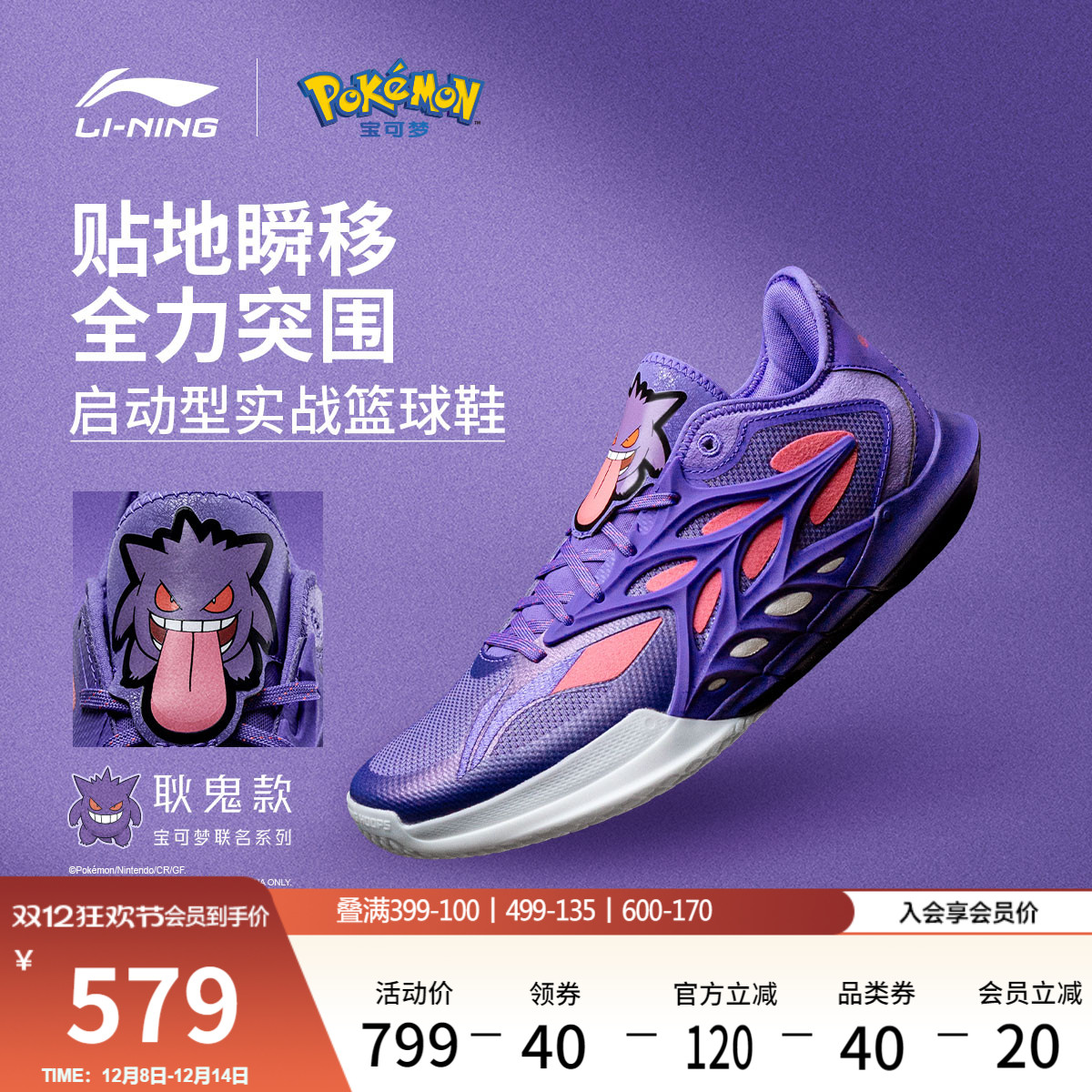 Li Ning Pokémon co-branded series blitzkrieg 12 Gengar | Basketball shoes, men's shoes, cushioning practical low-top sneakers
