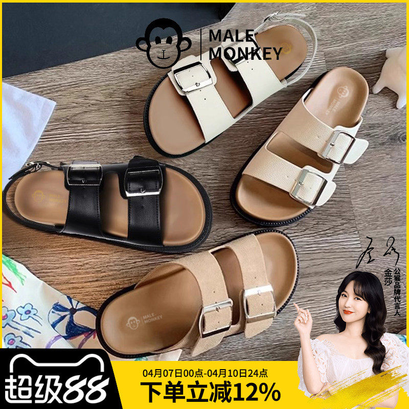 Male Monkey Leather Slippers Women's New Summer Platform Square Buckle Casual Birkenstock Sandals Flat Roman Sandals