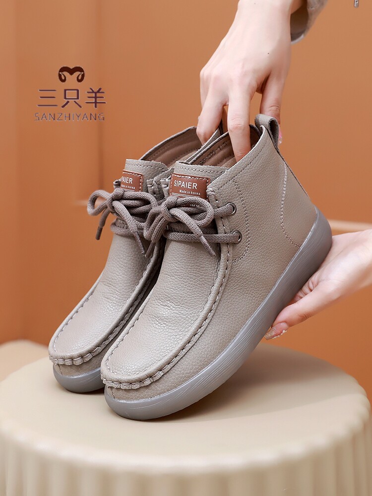 Three Sheep High-Top Lace-Up Boots 2025 New Autumn and Winter Thick-Soled Casual Mom Shoes Genuine Leather Non-Slip Soft-Soled Short Boots for Women