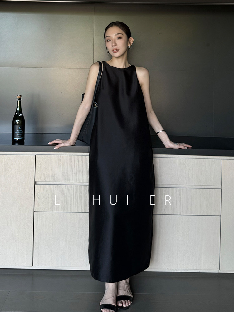 Lihuier Li Hui'Er Simple Black Spaghetti Strap Dress Women's Summer Sleeveless Vest Long Dress Backless Dress Formal Dress for Women