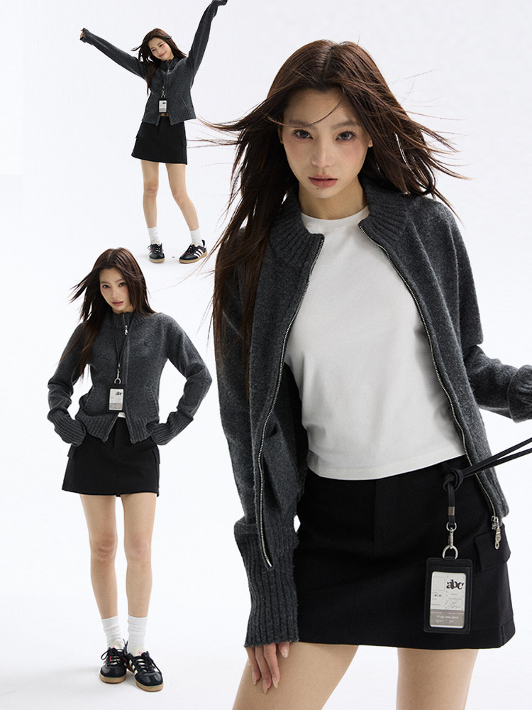 Heyabc Double-Zip Slim-Fit Knit Cardigan with Korean-Style Short Base Sweater in Dark Gray Pullover Top