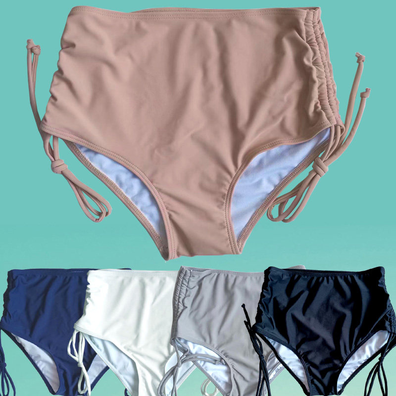 Women's High-Waisted Triangle Swim Trunks with Drawstring, Nylon Elastic Fabric, Anti-Exposure, Safety, Light Gray, Navy Blue, Black, Milky White, Skin Color, Pink