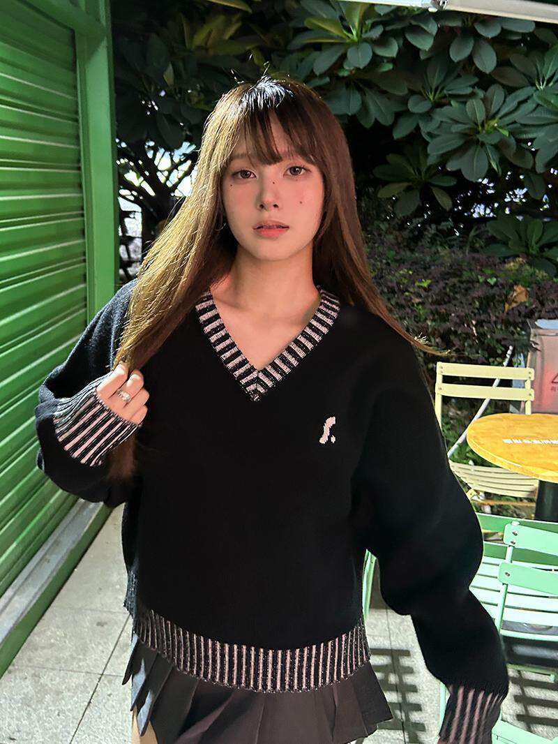 Symocolor Commuter Style Spring and Autumn Niche Striped Edge V-Neck Sweater Loose Retro Lazy Casual Knit Top