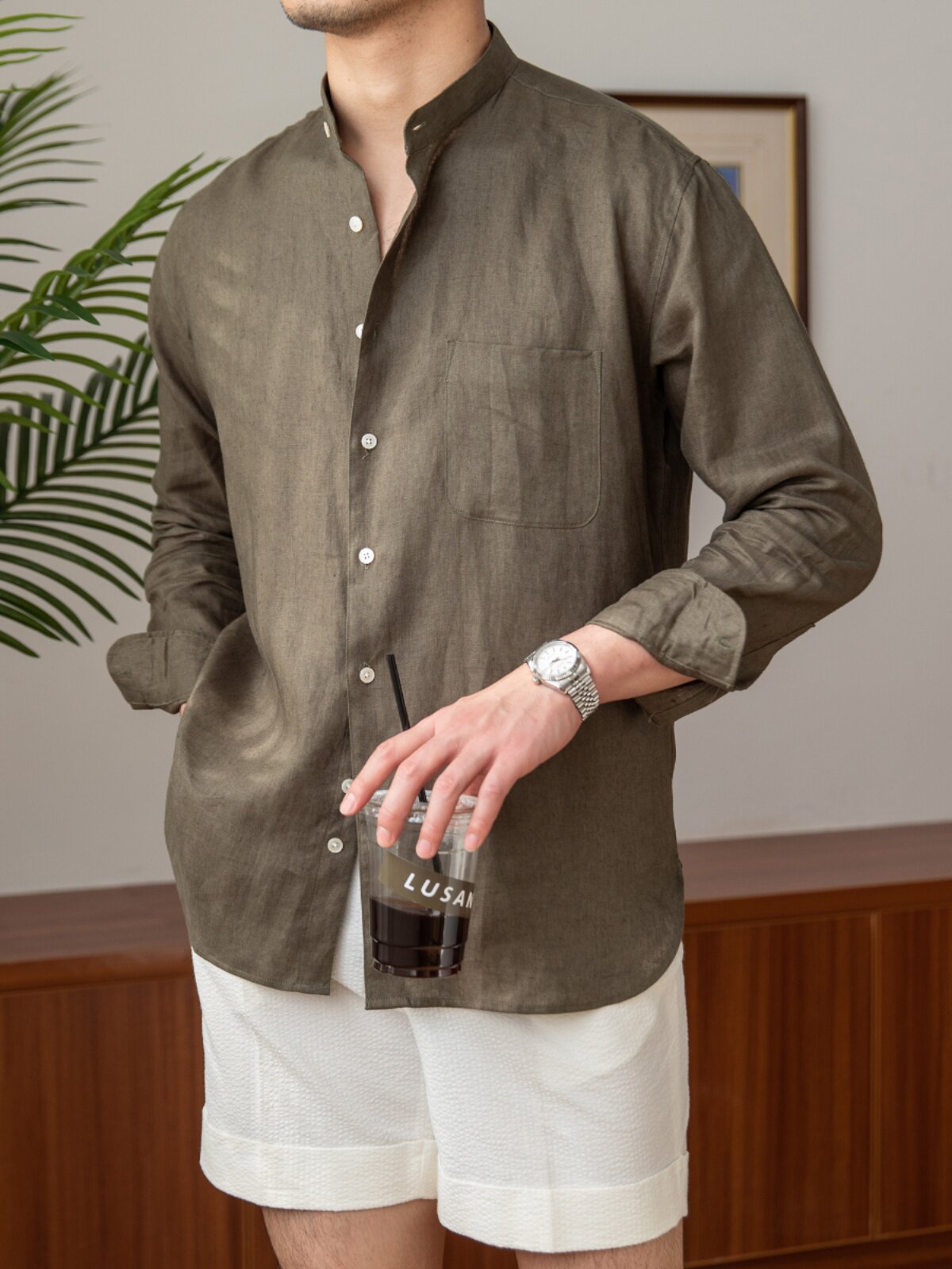Mr. Lu San LAOSHU Loose Fit Casual Breathable Pure Linen Long-Sleeve Shirt Versatile Vacation Stand-Up Collar Shirt for Men