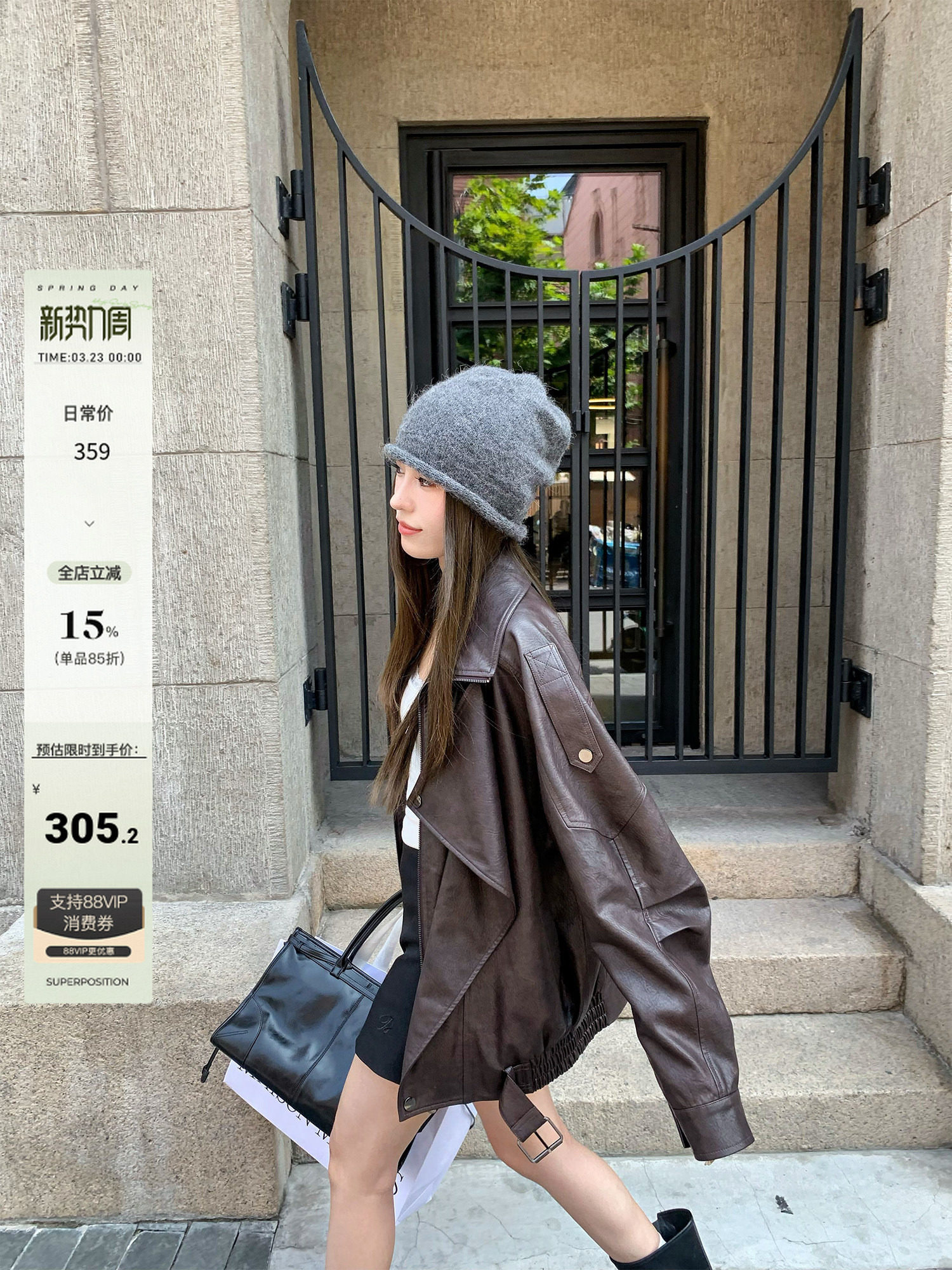 Hhyii Manhattan Brown Leather Jacket for Women, New Spring and Autumn American-Style Biker Jacket with a High-End Silhouette