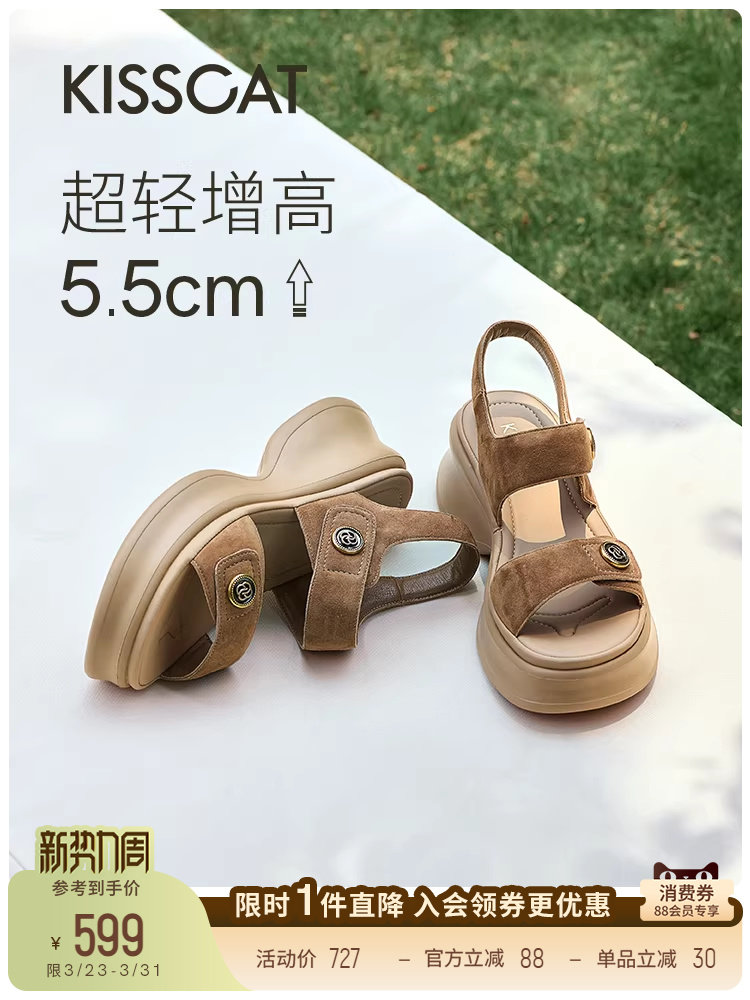 Kisscat [5.5cm Coin-Length Long-Leg Sports Sandals] Thick-Soled Height-Increasing Velcro Sports Sandals for Women