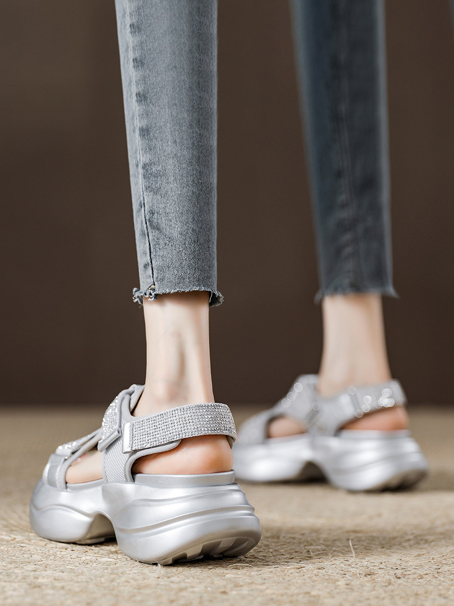 Dad-Style Sandals for Women, Thick-Soled, Height-Increasing, Sporty Casual Slippers, 2025 Summer New Model, Velcro, Rhinestone Beach Shoes