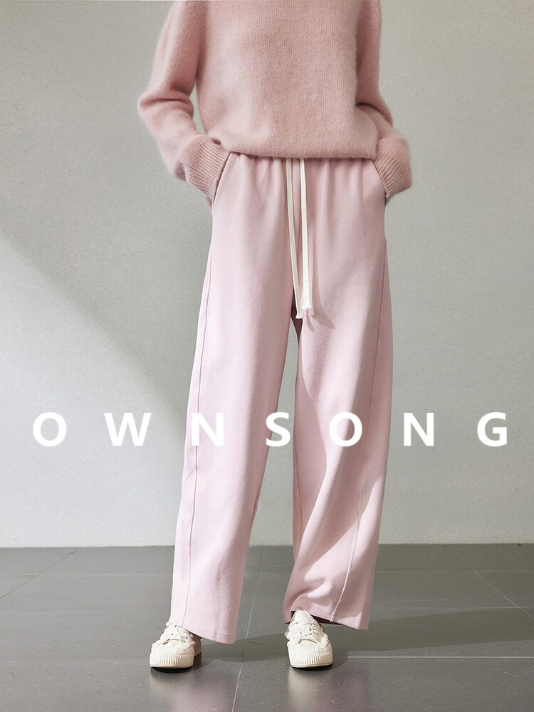 Ownsong Pink American Casual Sports Scythe Pants, High-Waisted, Fleece-Lined, Thickened, Loose Wide-Leg Sweatpants for Women