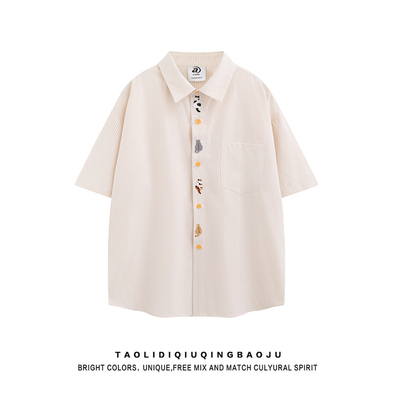 Japanese-Style Fun Cat Embroidery Short-Sleeve Polo Shirt for Women, Summer Loose Fit, Bf Lazy Style, Couple's Versatile Striped Shirt