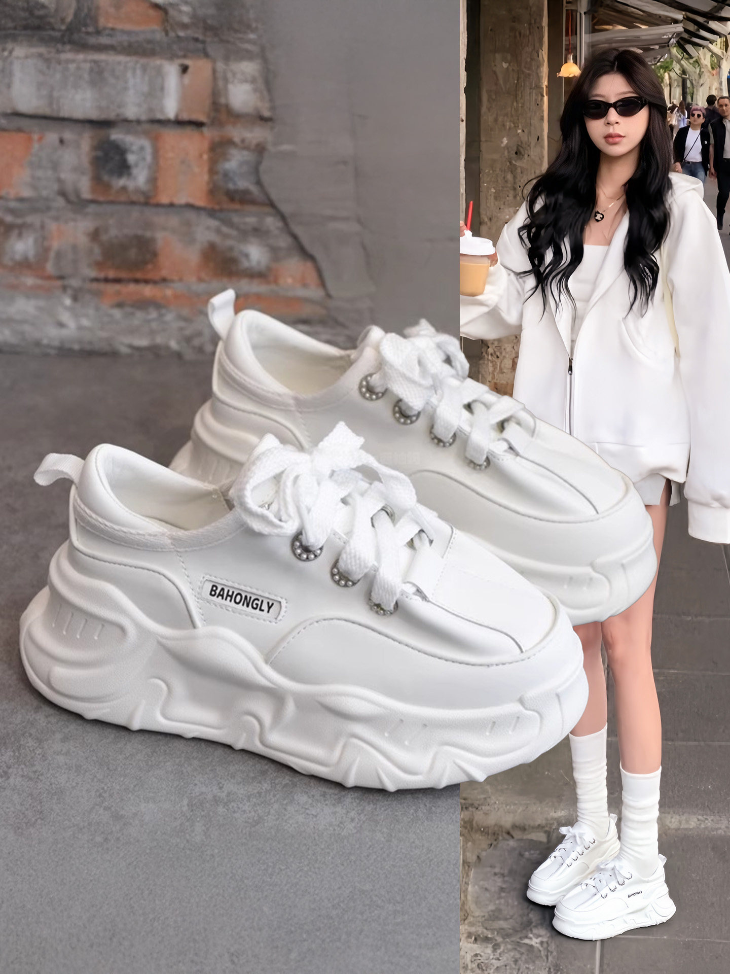 Hong Kong Style Height-Increasing Fashion White Sneakers for Women 2026 Spring and Autumn Genuine Leather Lace-Up Versatile High-End Casual Thick-Soled Dad Shoes