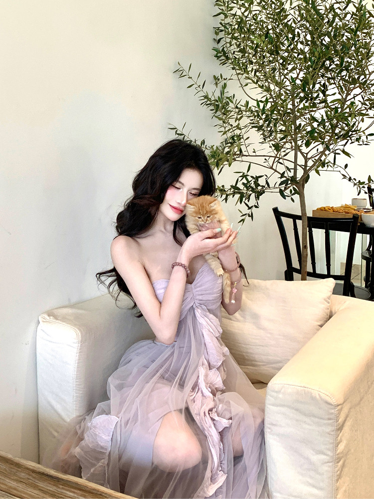Dusty Holiday Style Dress 2026 Early Spring New Design Strapless Long Dress Purple Mesh Skirt