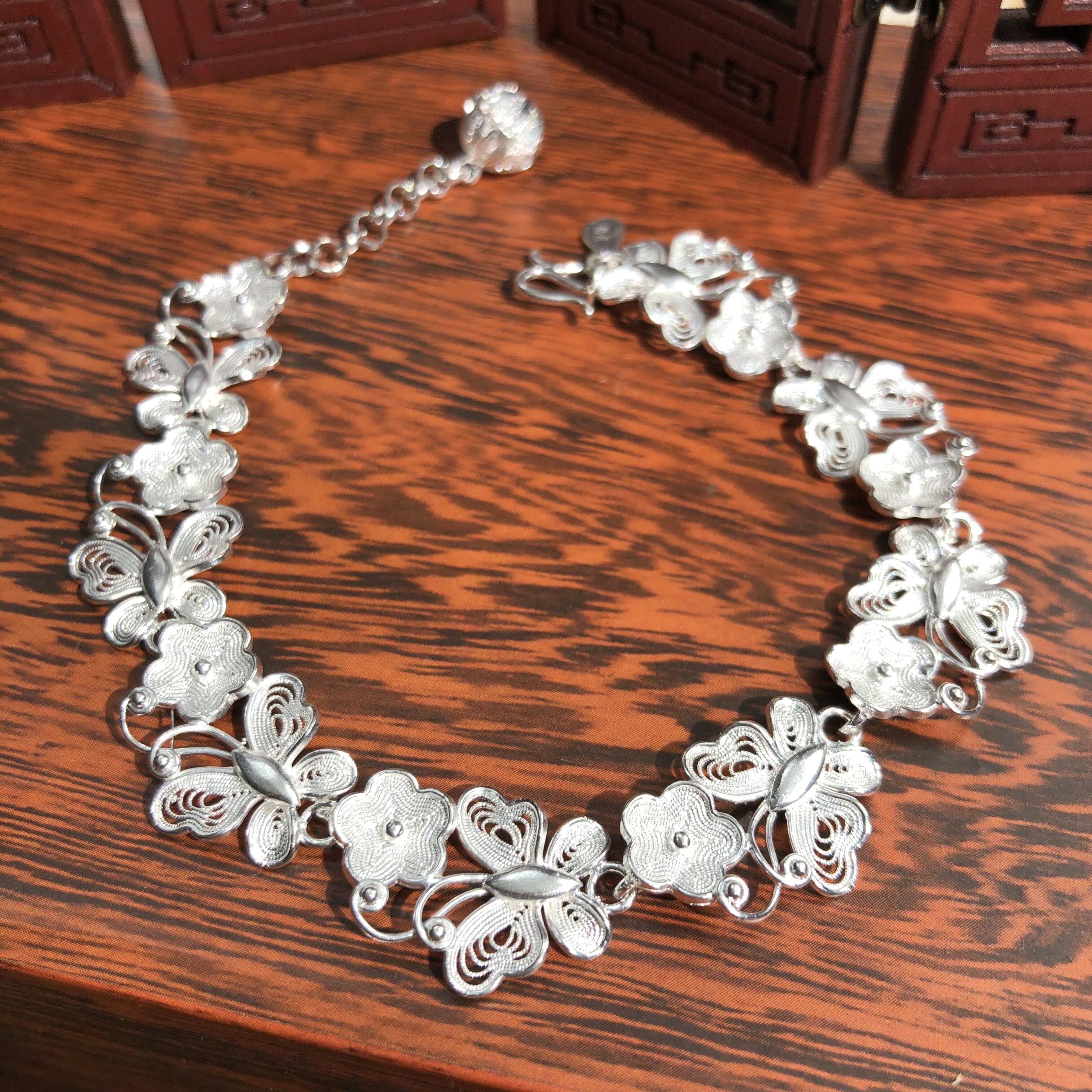 Butterfly Love Flower Bracelet, Pure Silver Brushed Bracelet, Ethnic Style, 8 Grams or More
