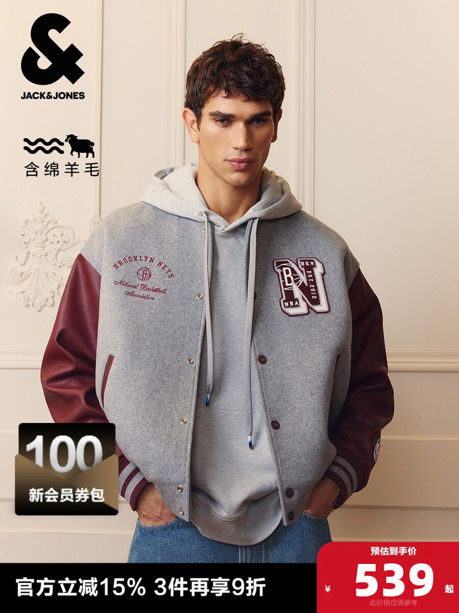 Jack Jones Outlet Nba Collaboration Men's Woolen Coat, New Spring and Autumn Embroidered Baseball Collar Loose Jacket