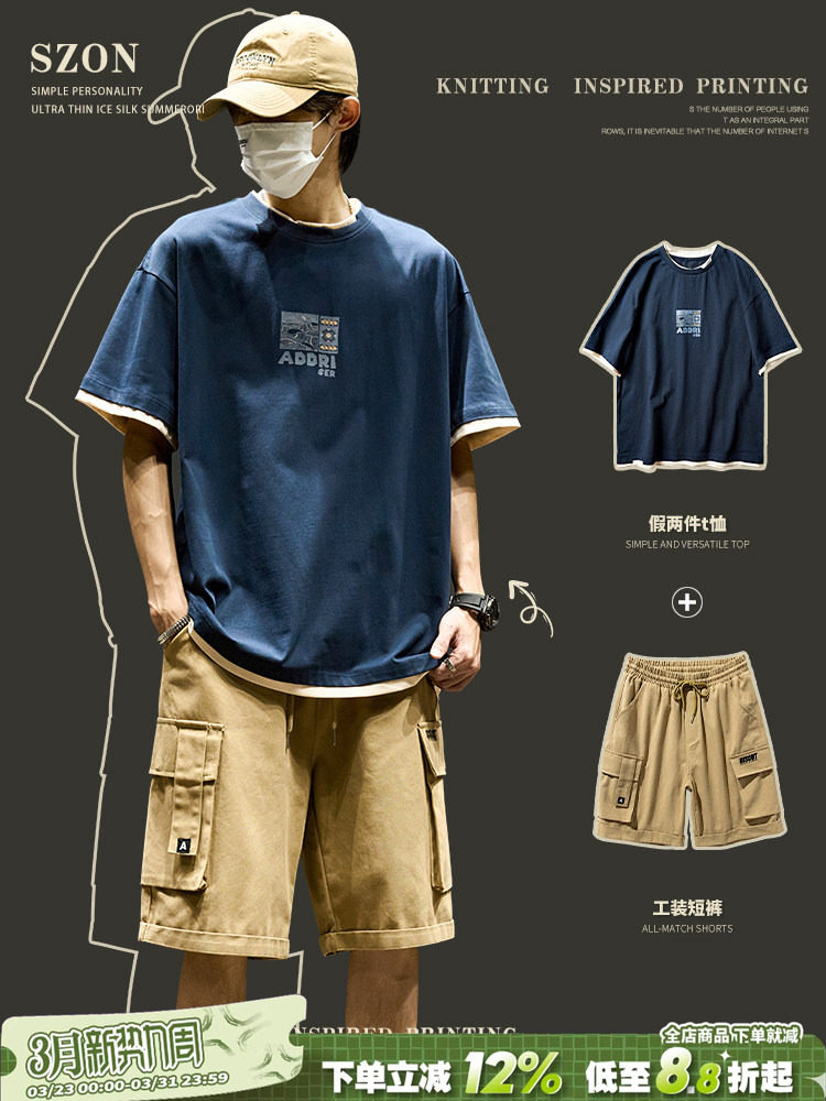 Short-Sleeved Suit for Men in Summer, Loose and Casual, a Set of Fake Two-Piece T-Shirts Paired with American-Style Trendy Work Shorts