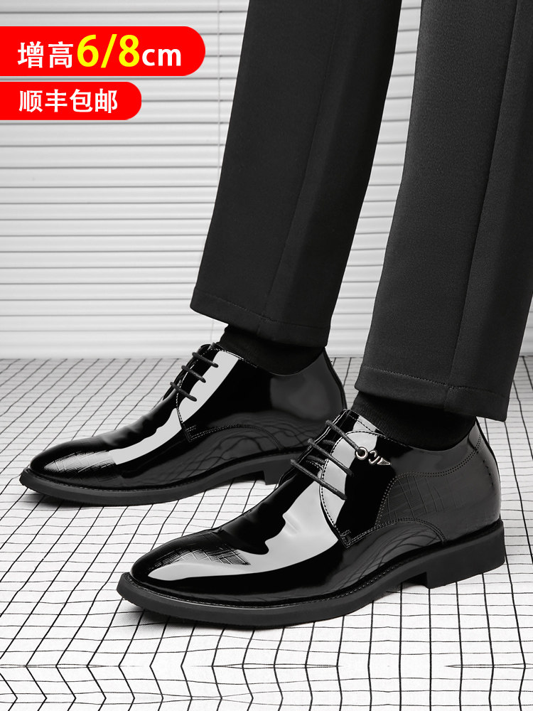 Genuine Leather Height-Increasing Shoes for Men, 8Cm/6Cm, Young Men's Shiny Leather Business Formal Shoes, Patent Leather Pointed Toe Wedding Height-Increasing Shoes