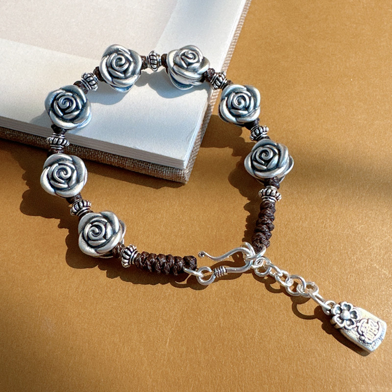 999 Pure Silver Rose Flower Bracelet, Hand-Woven, Unisex, Chinese Style, New Chinese Style Accessories, Three-Dimensional Flower Gift