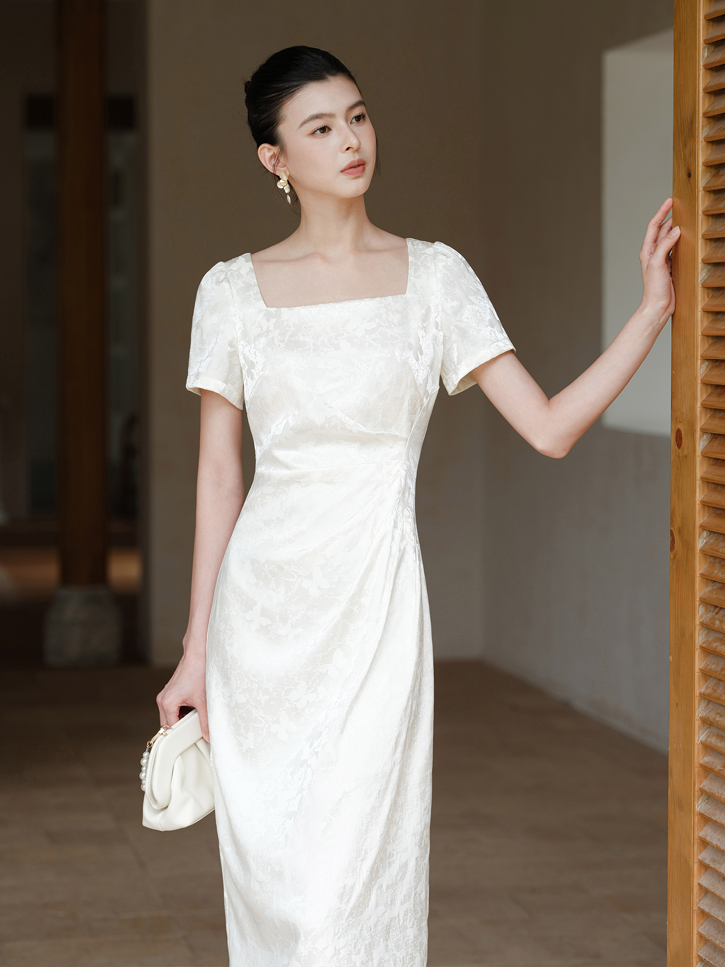 Chu Chanyi's New Chinese-Style Dress for Women, 2025 Summer New Model, Elegant and Slim-Fitting Jacquard Pleated Square-Neck Long Dress