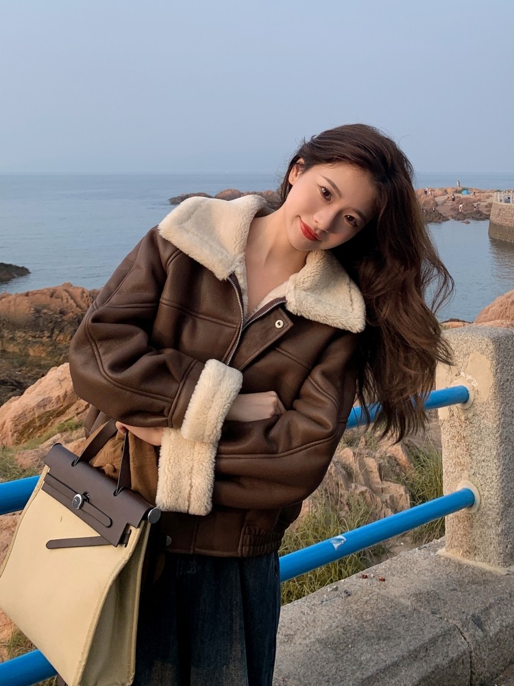 Sheepskin Fur Coat for Women, Winter Brown, Fleece-Lined and Thickened, 2025 New Style, Leather Jacket, Fur Integrated Motorcycle Jacket