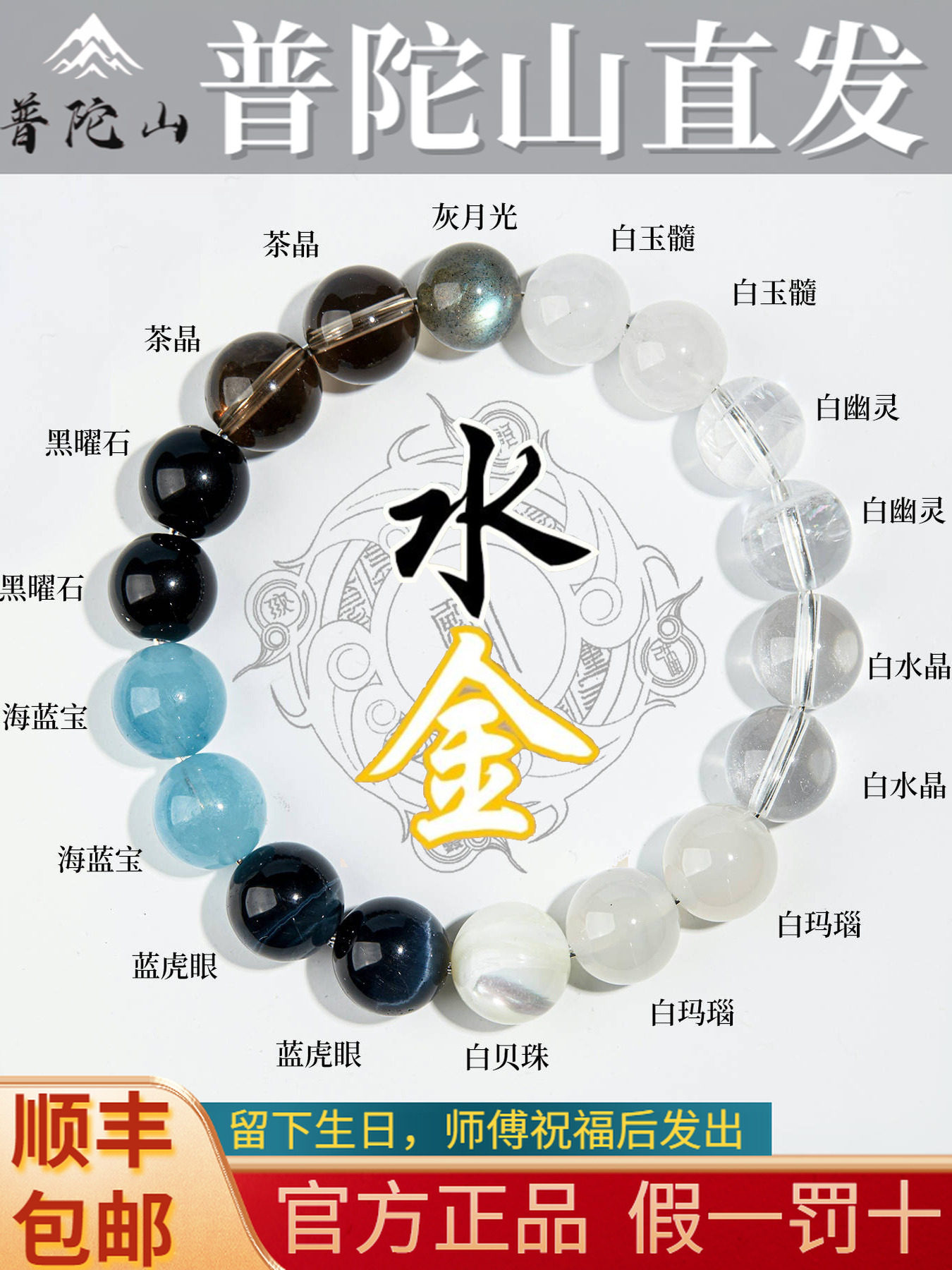 Putuo Mountain Zodiac Year Five Elements Natural Crystal Bracelet Aquamarine Obsidian White Crystal Agate Men's and Women's Bracelet
