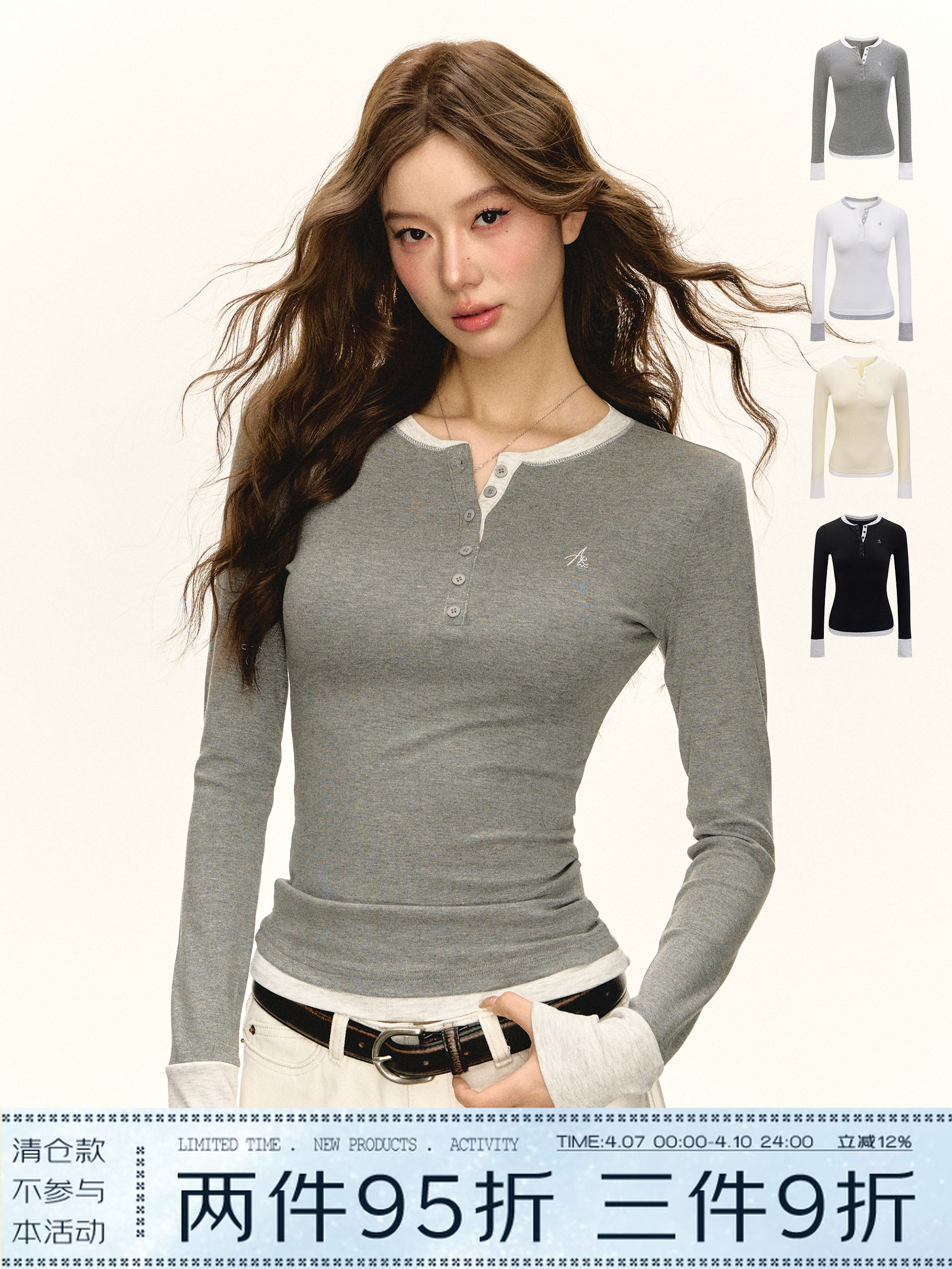 Ariseism American Retro Design Henley Collar Fake Two-Piece Long-Sleeved T-Shirt for Women Spring New Slim-Fitting Top