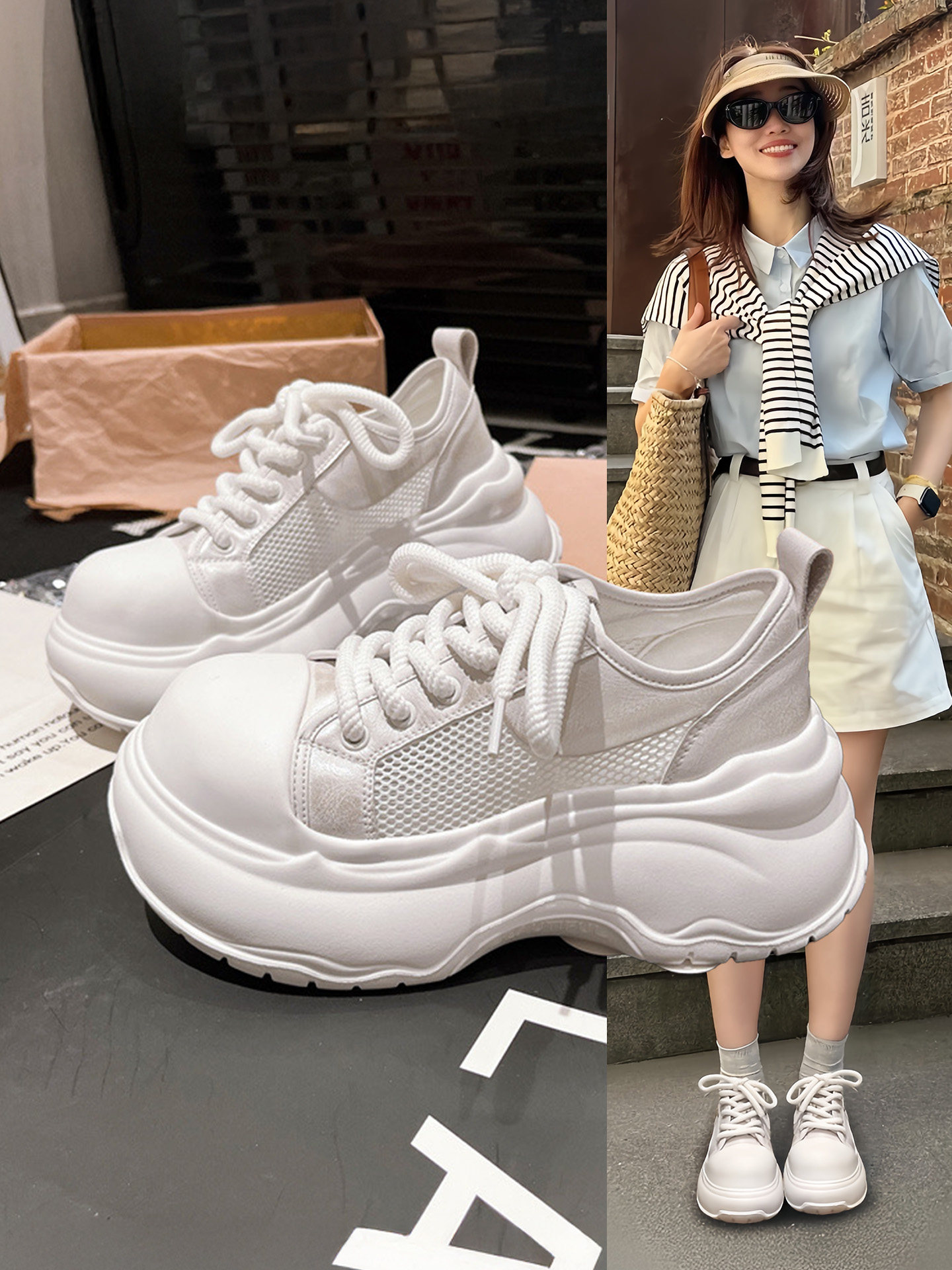 Italy Sanli~ Fashionable Thick-Soled Height-Increasing Casual White Sneakers for Women, New Versatile Round-Toe Mesh Panel Shoes