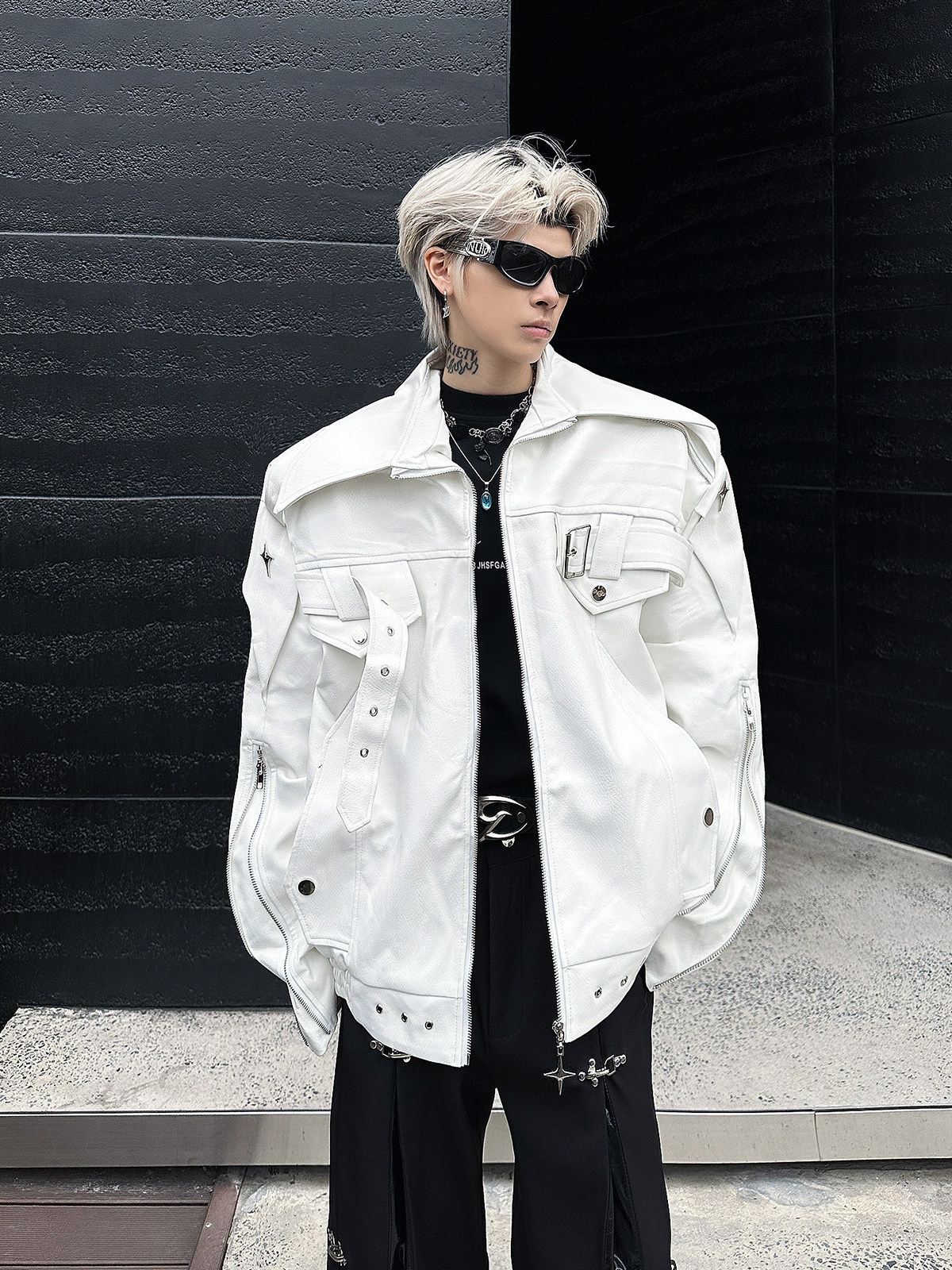 White Deconstructed Biker Leather Jacket for Men, Spring and Autumn Style, Vibe American High Street, Cool and Loose Casual Heavy-Duty Jacket