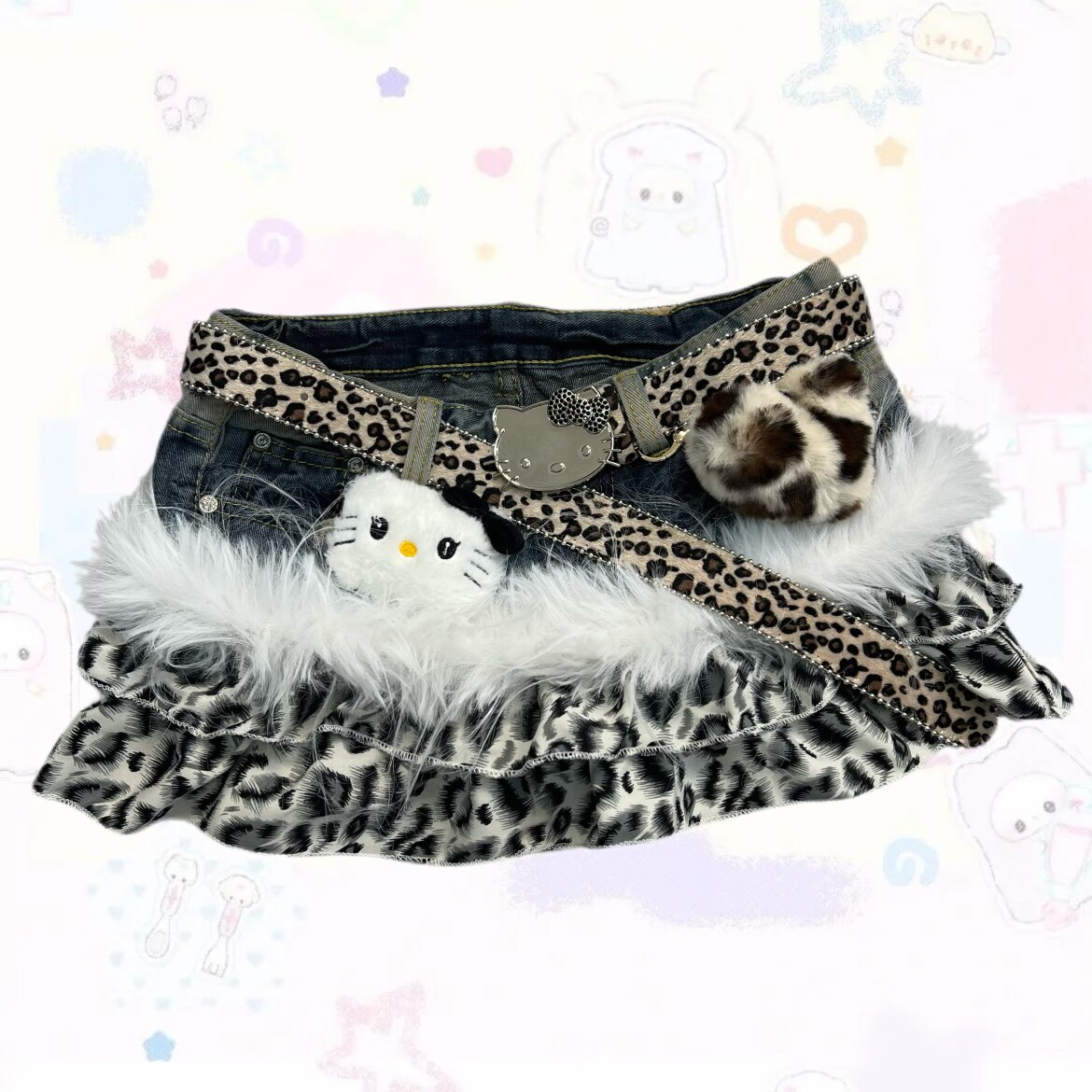 Y2K Vintage Hot Girl Low-Waisted Leopard Print Kitty Cute Millennium Handmade Patchwork Cake Short Skirt Winter