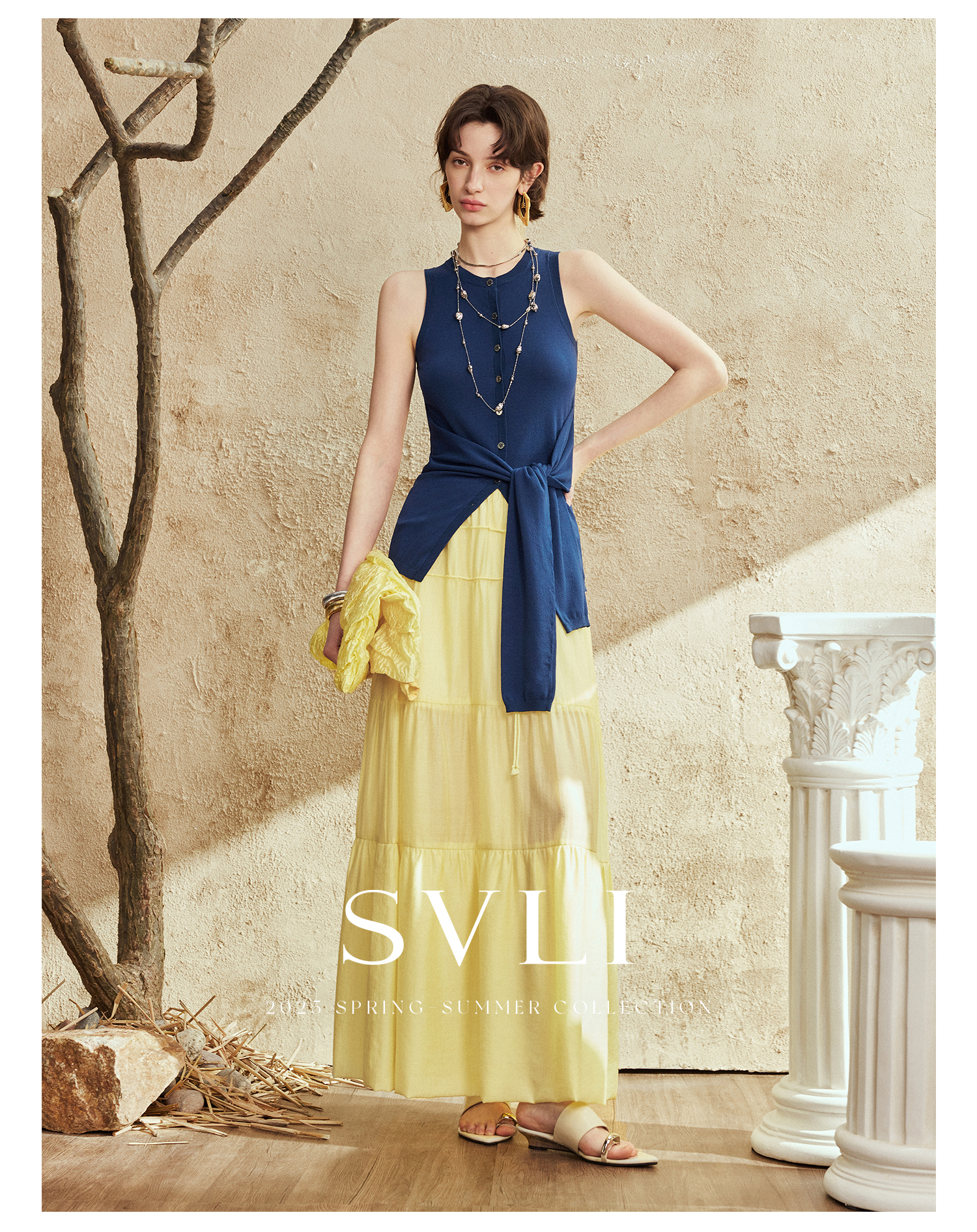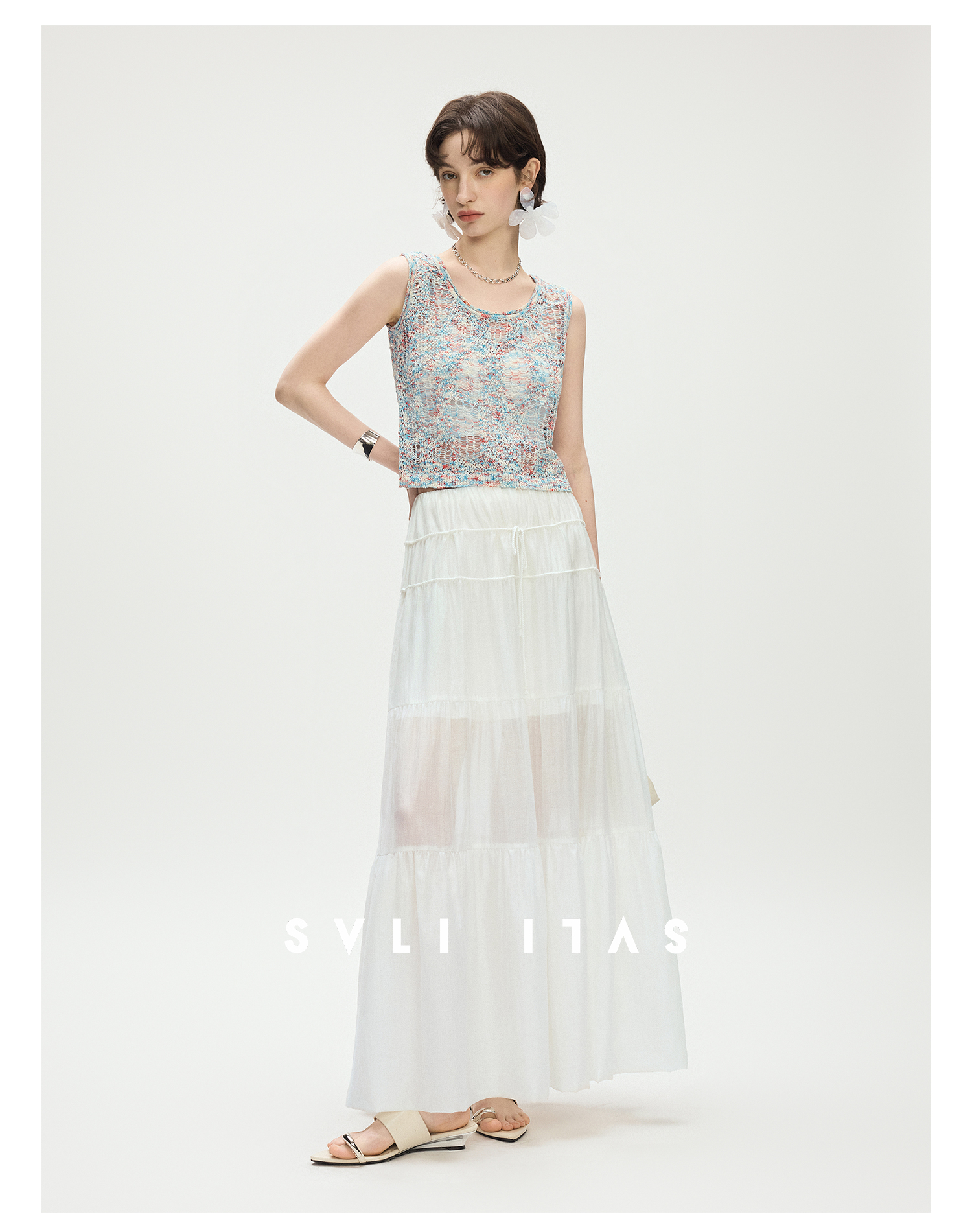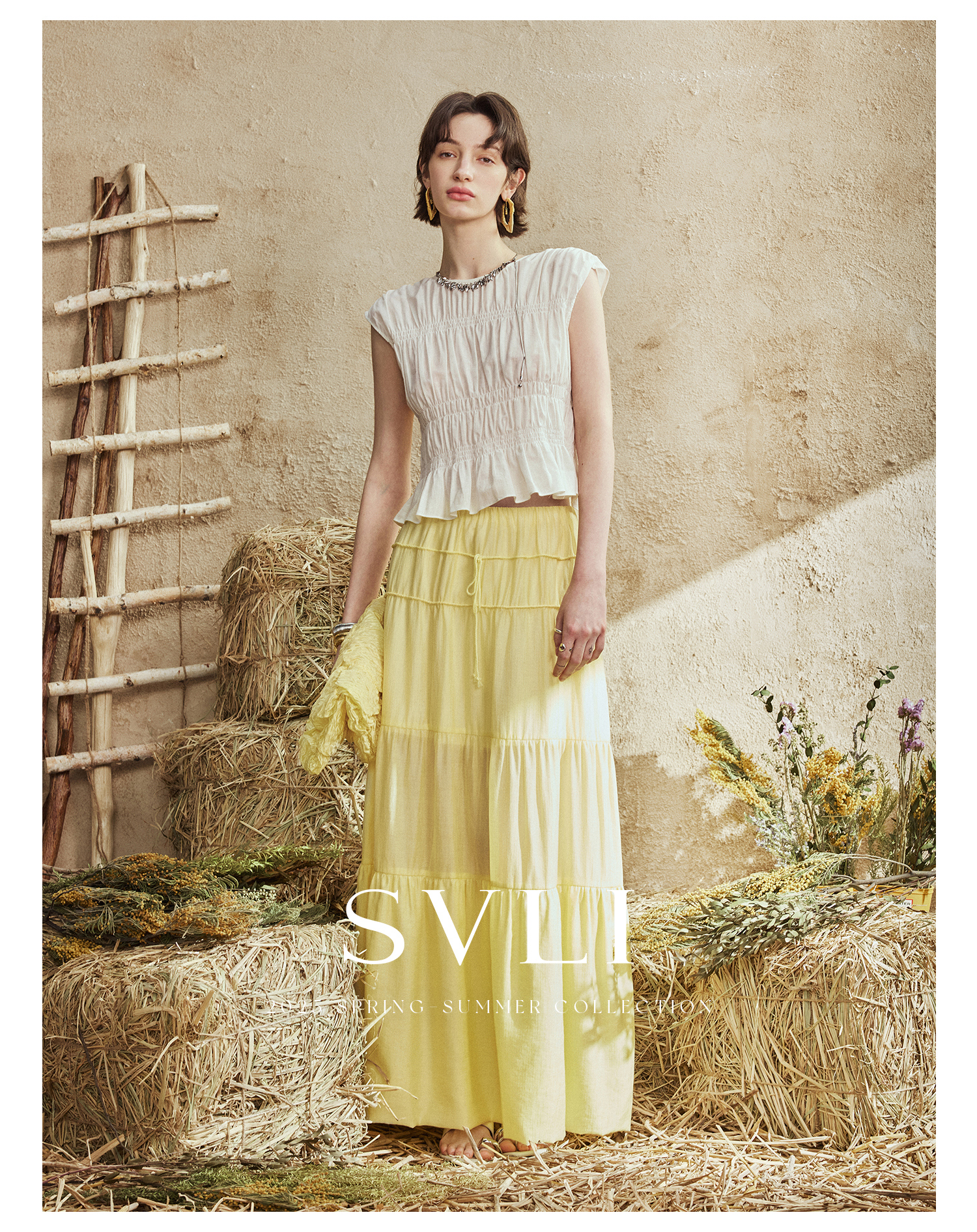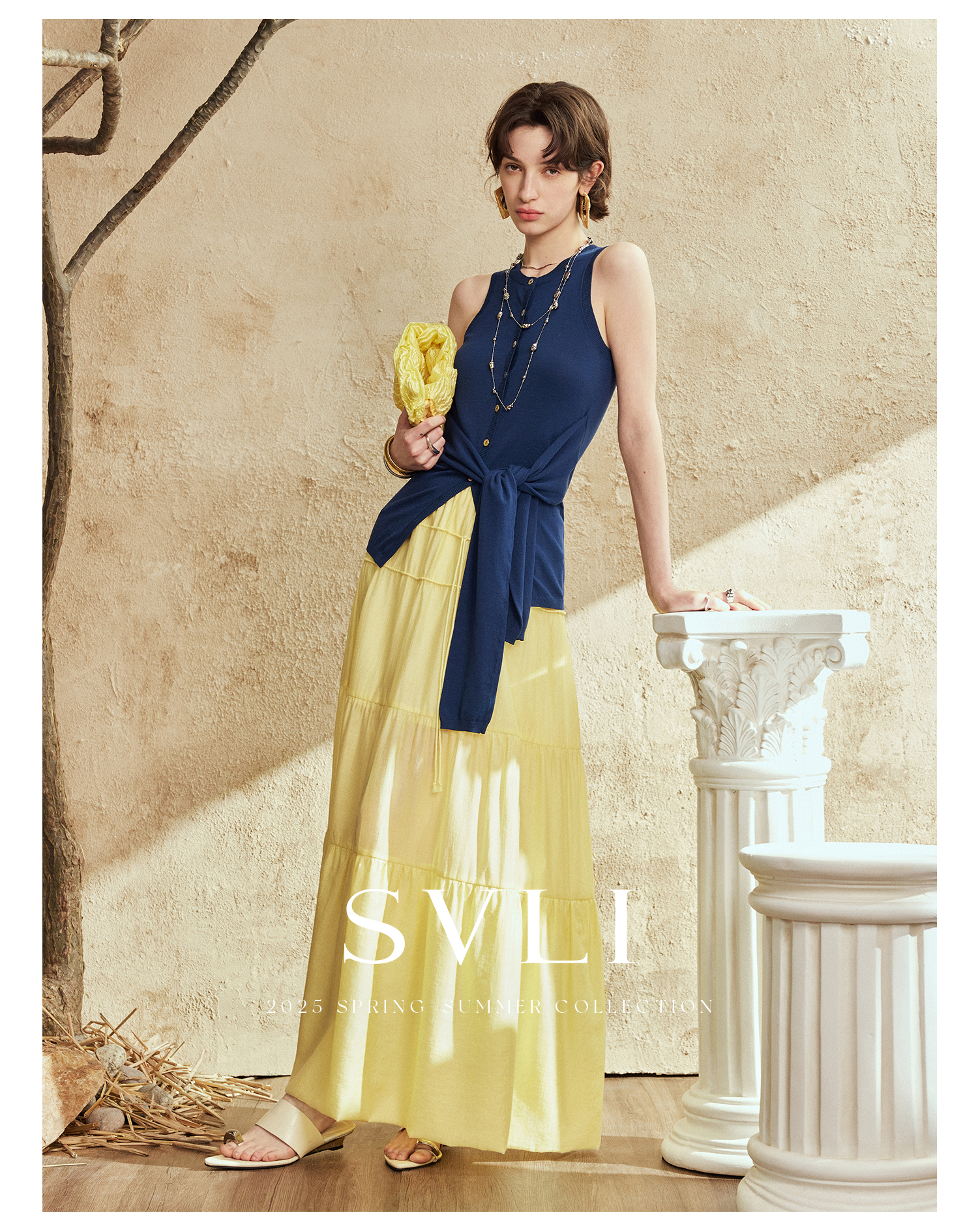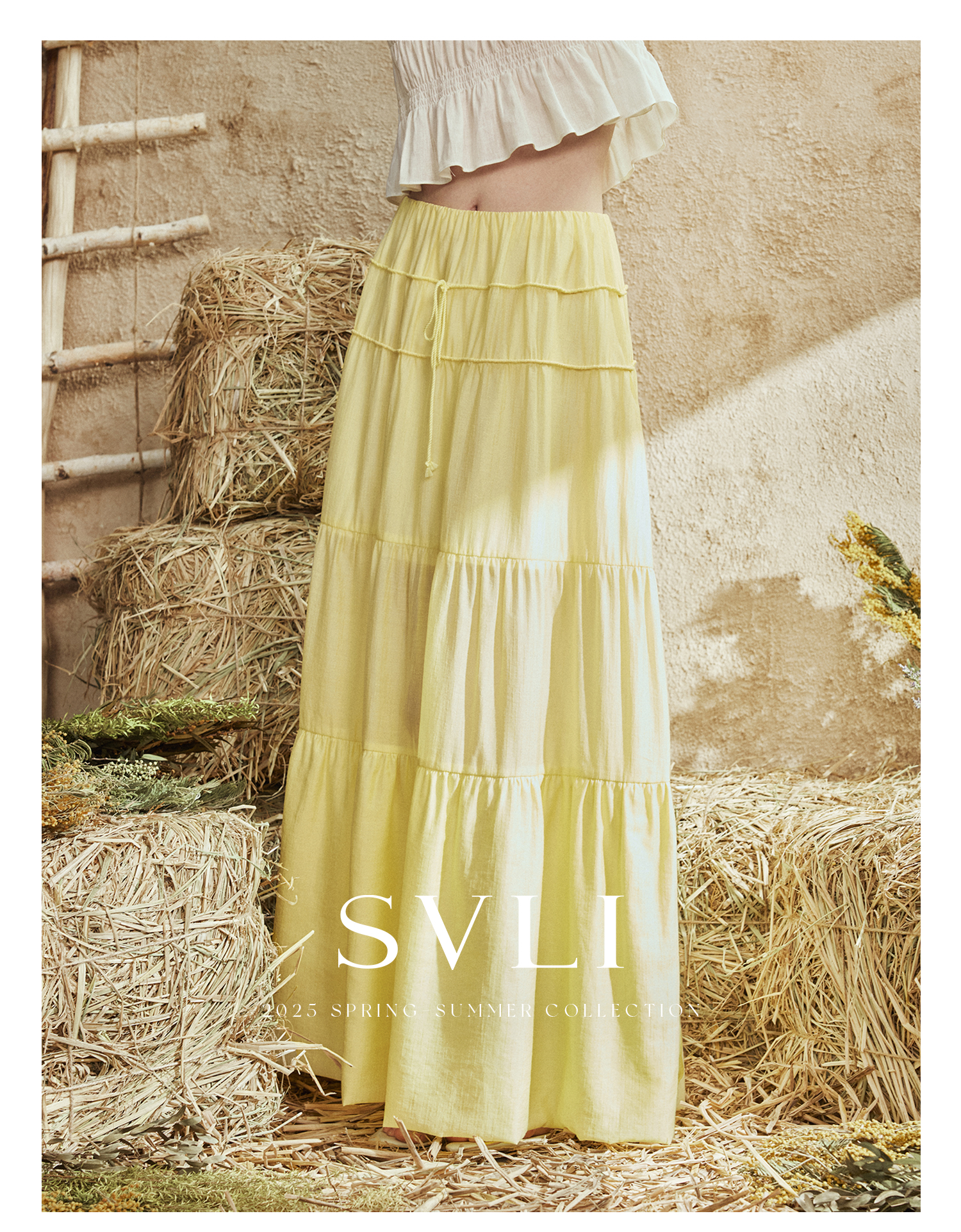 Svli|'Island Romance' Lightweight Lyocell Textured Layered Ruched Tie A-Line Long Skirt