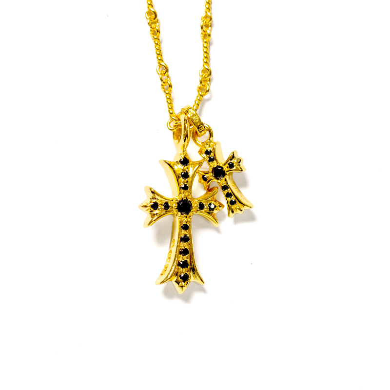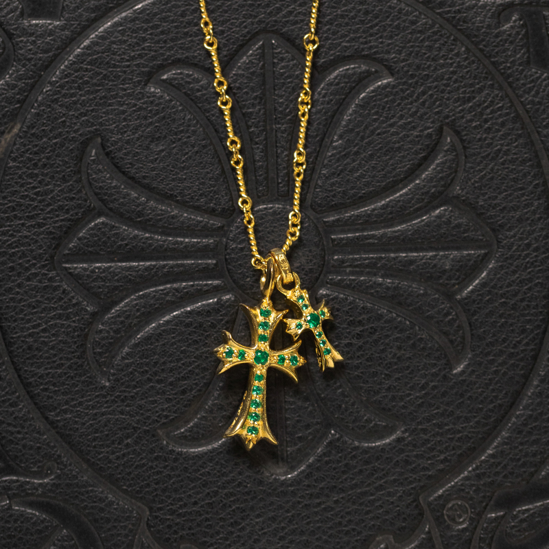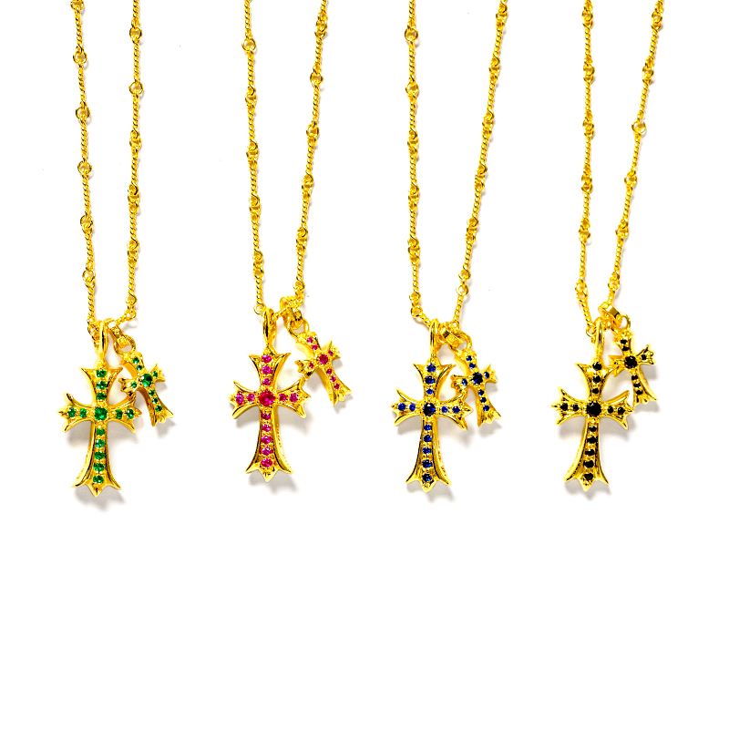 Wild Horse Manor 22K Gold-Plated Necklace with Blue-Green Crystal Large and Small Crosses, Babyfat Bamboo Chain, Twist Chain