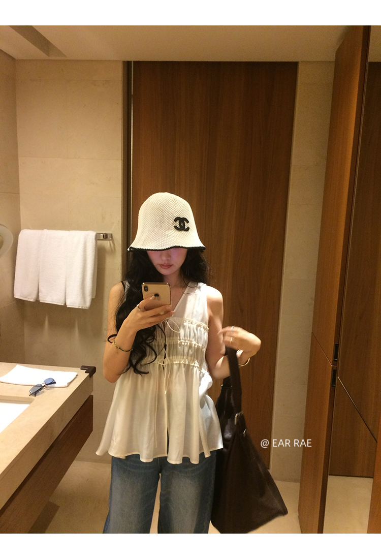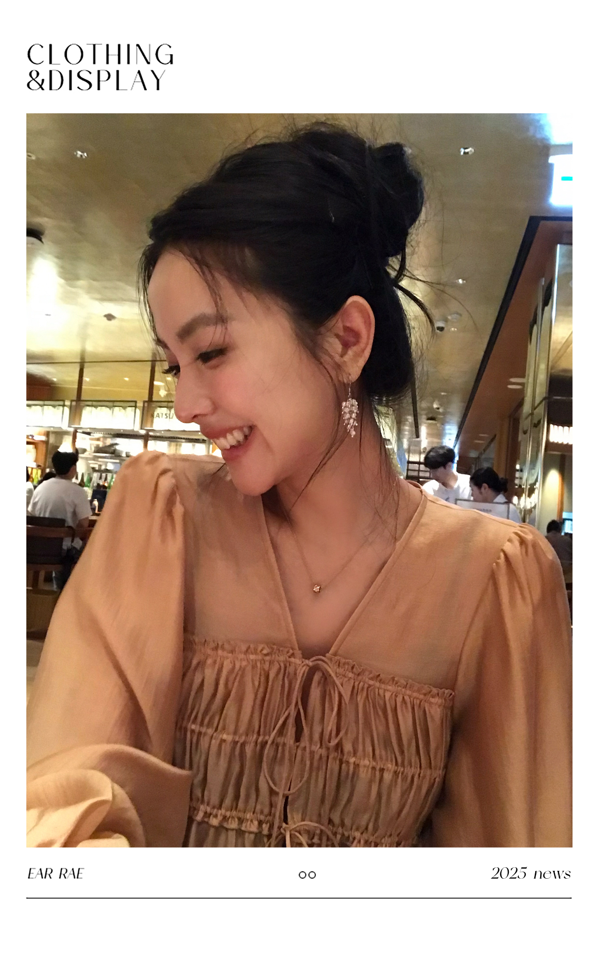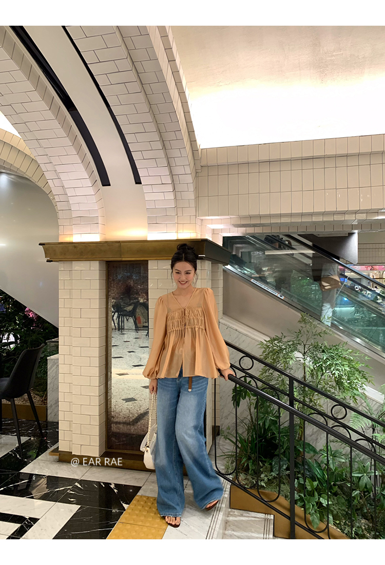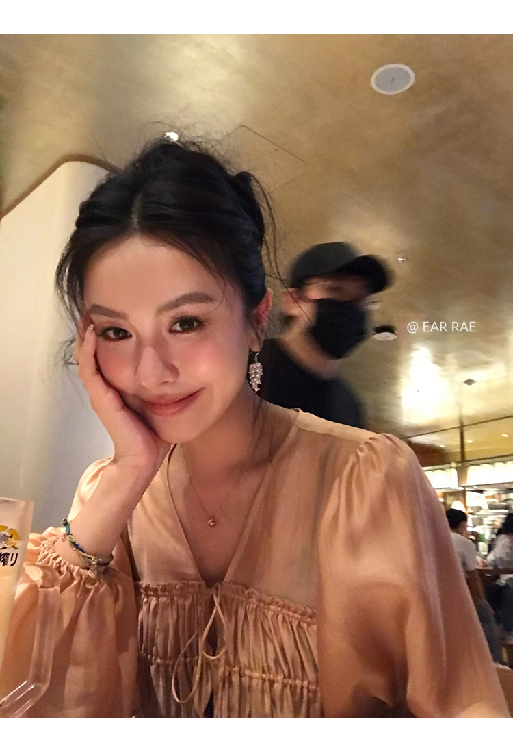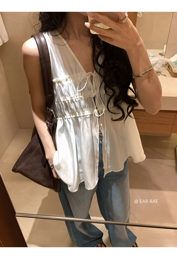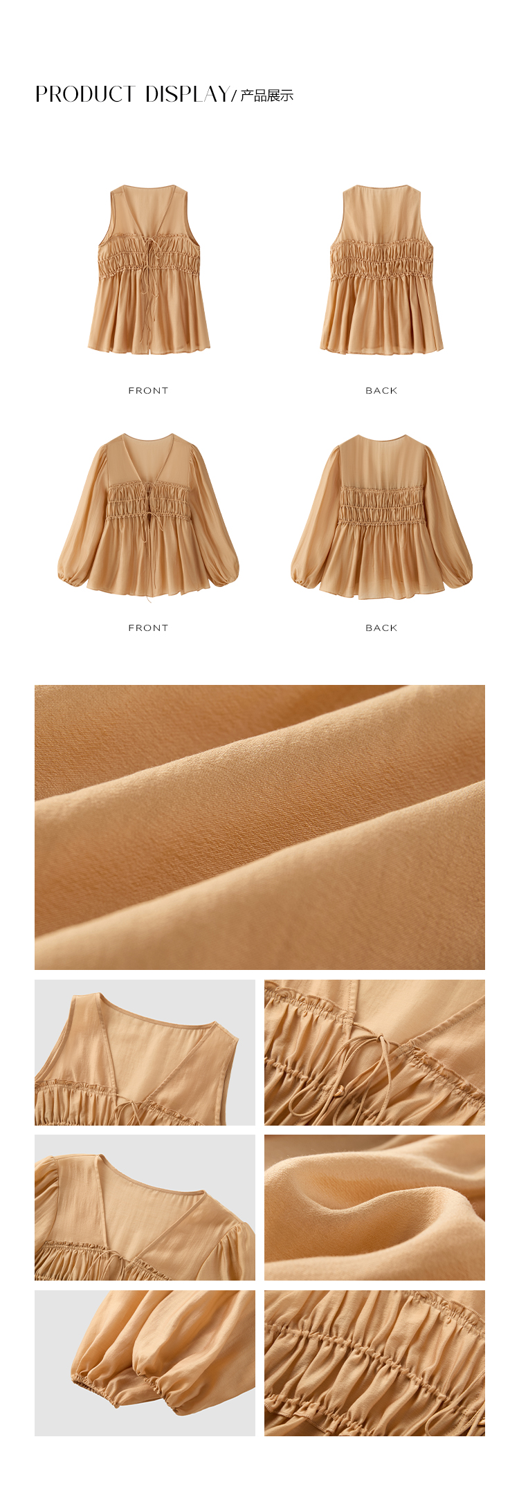 Ear Rae Summer Shimmering Lyocell Tencel Ruched Tie V-Neck Blouse Elegant Long-Sleeve Sleeveless Top