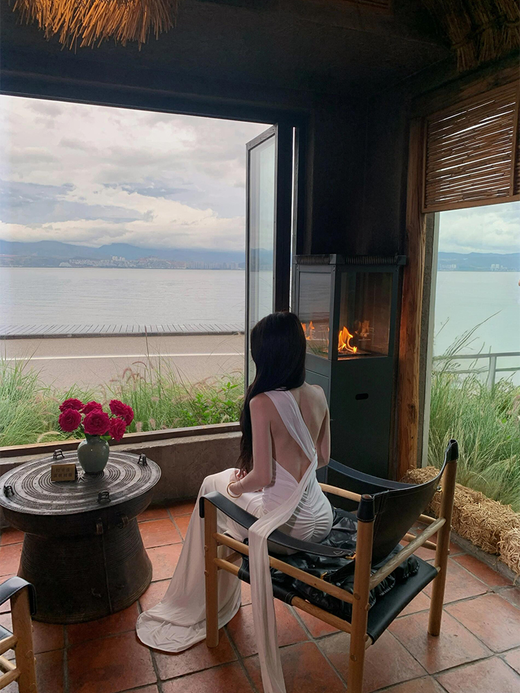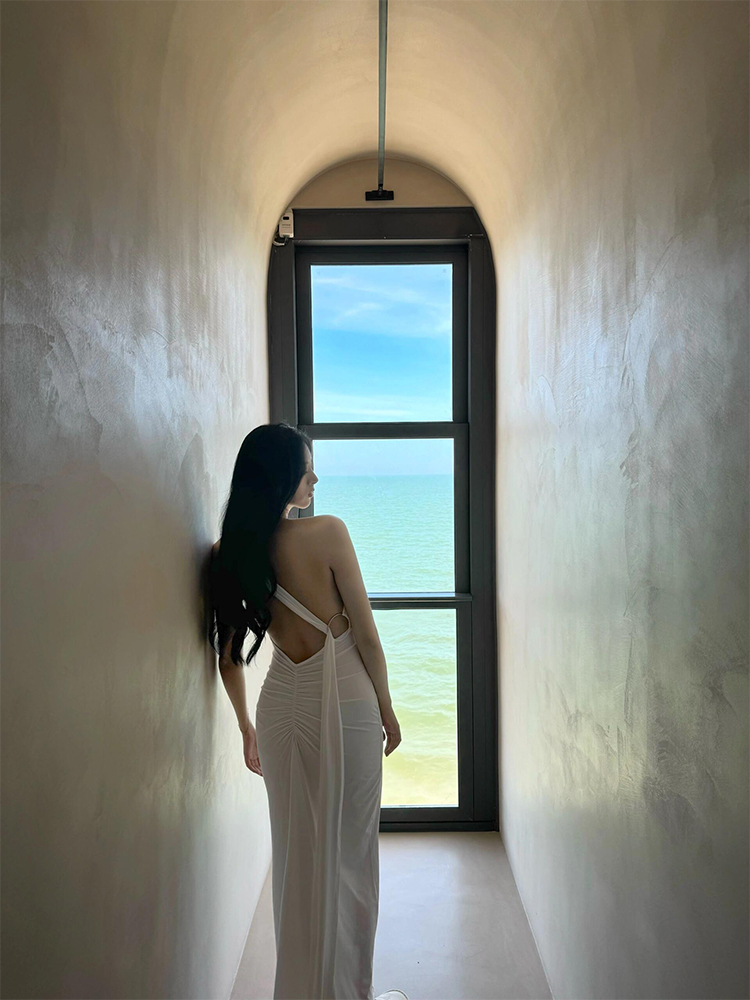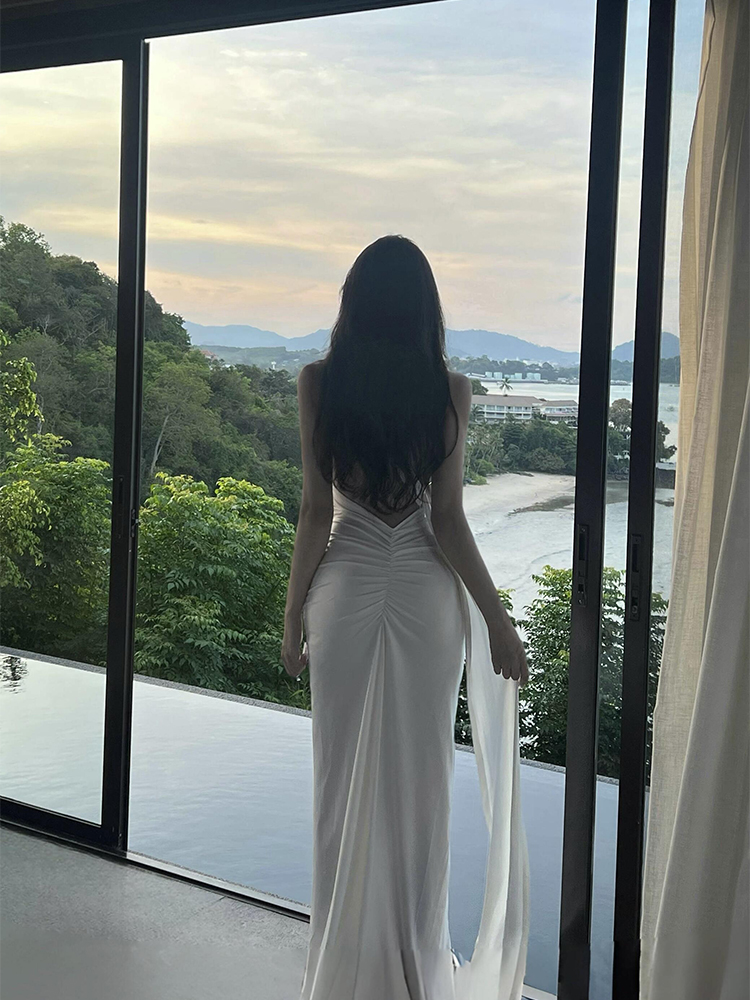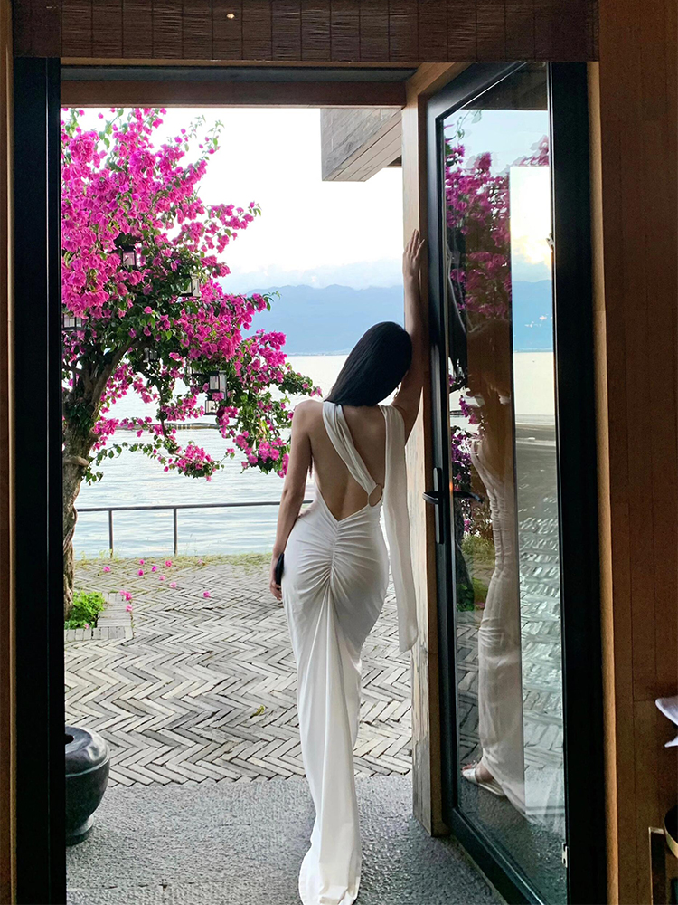 French-Style White Ribbon Sexy Backless Dress for Women, Beach Vacation Dress, Annual Party Dress, Long Dress