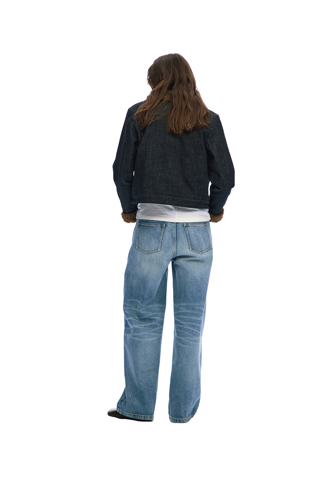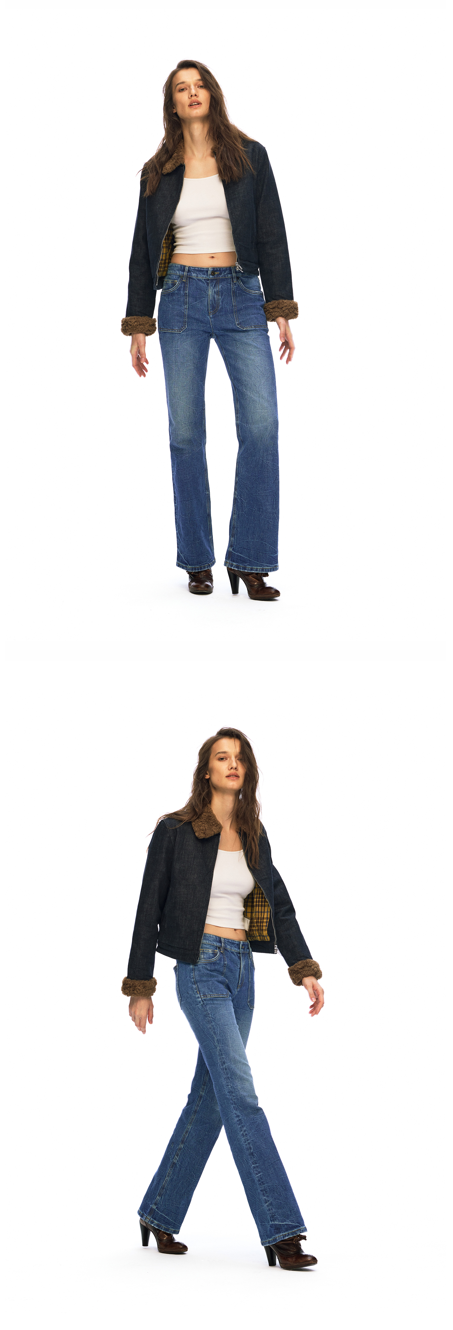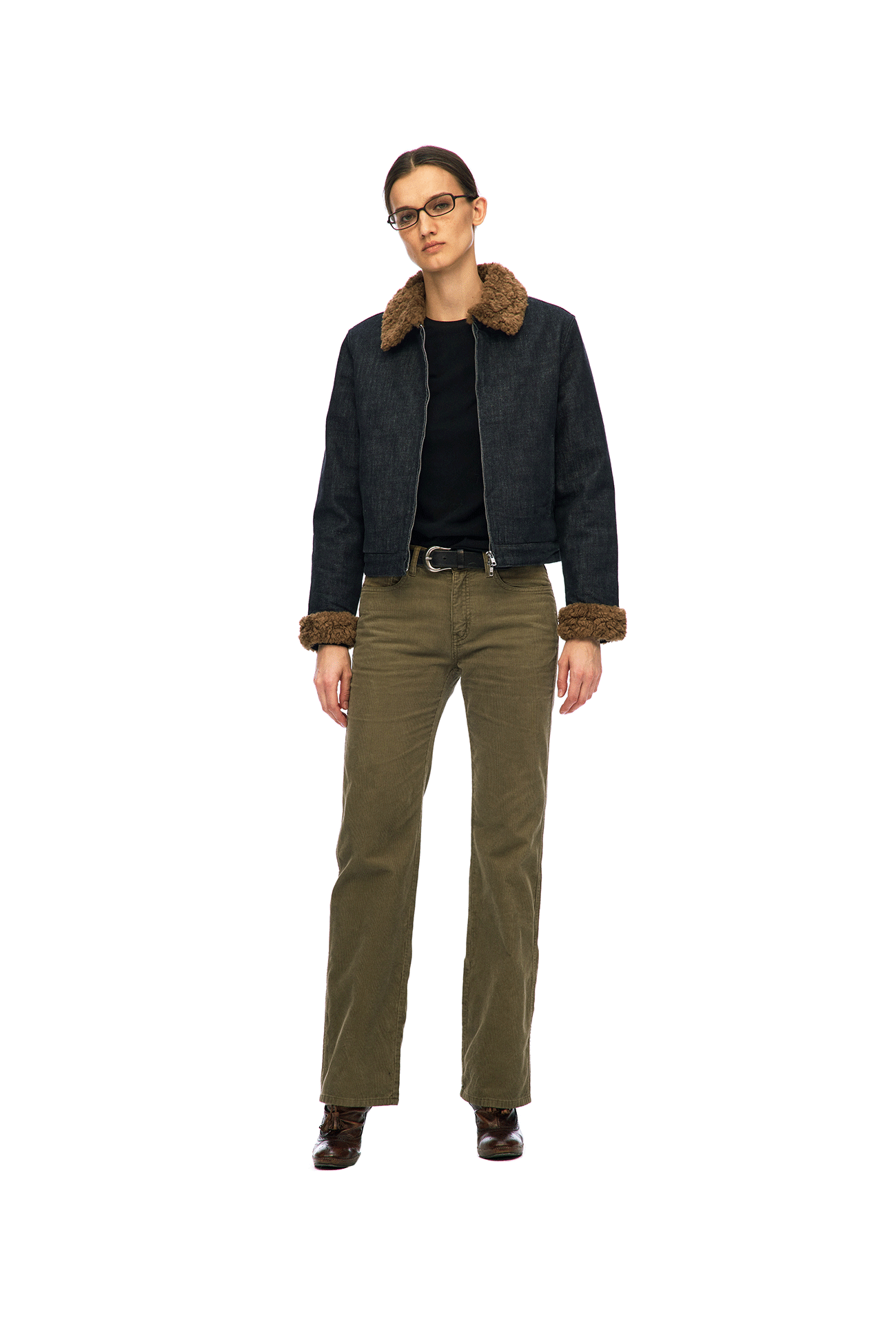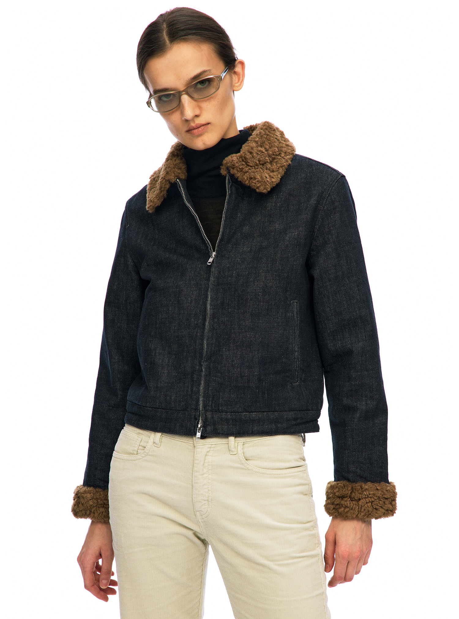 Alright Then, Denim Patchwork Cotton Blend Yellow Plaid Short H-Shaped Denim Jacket with Fur Collar