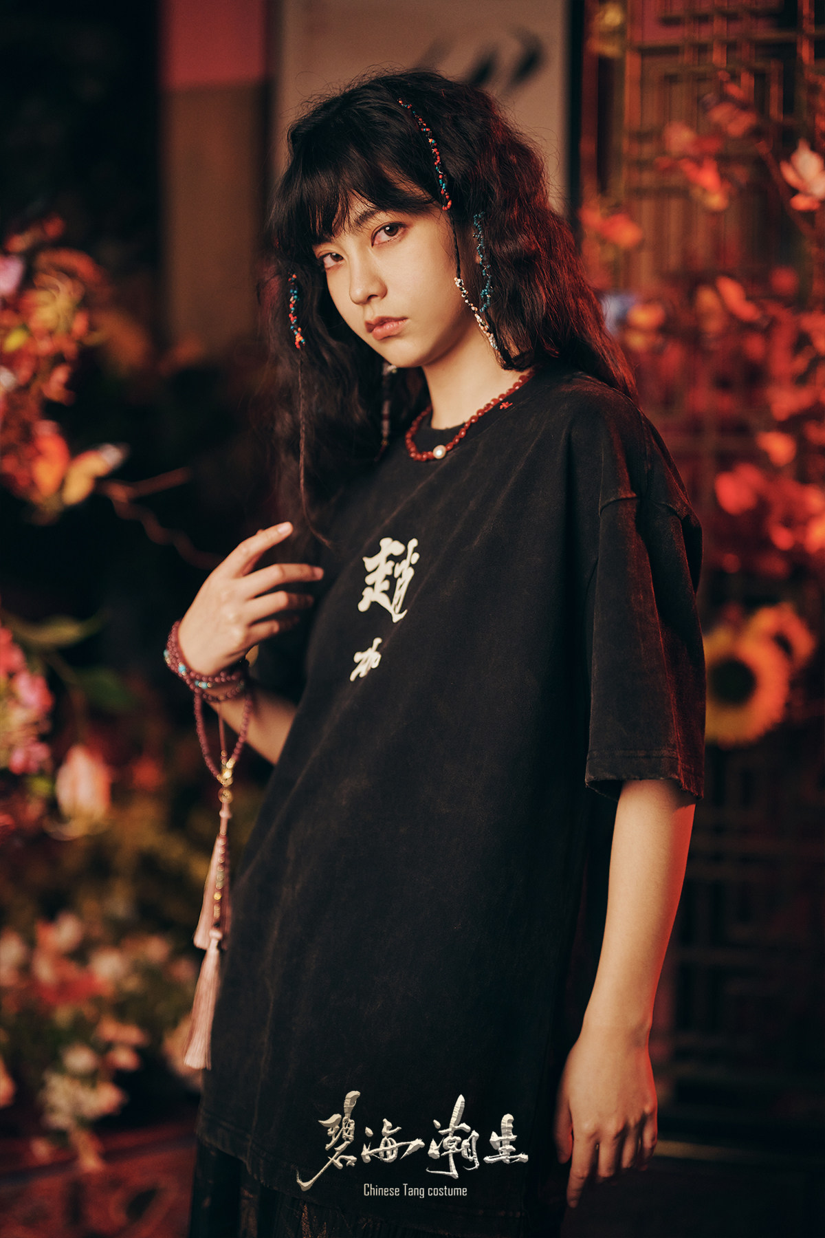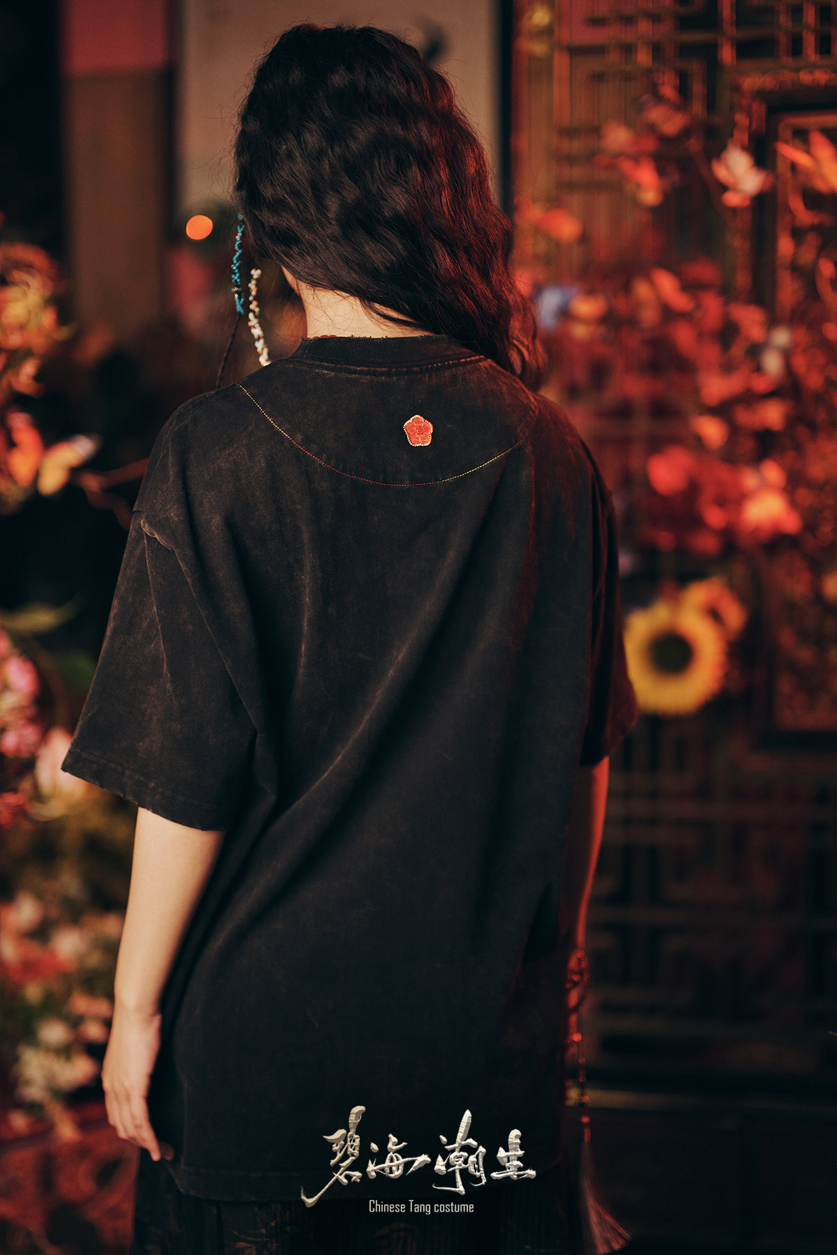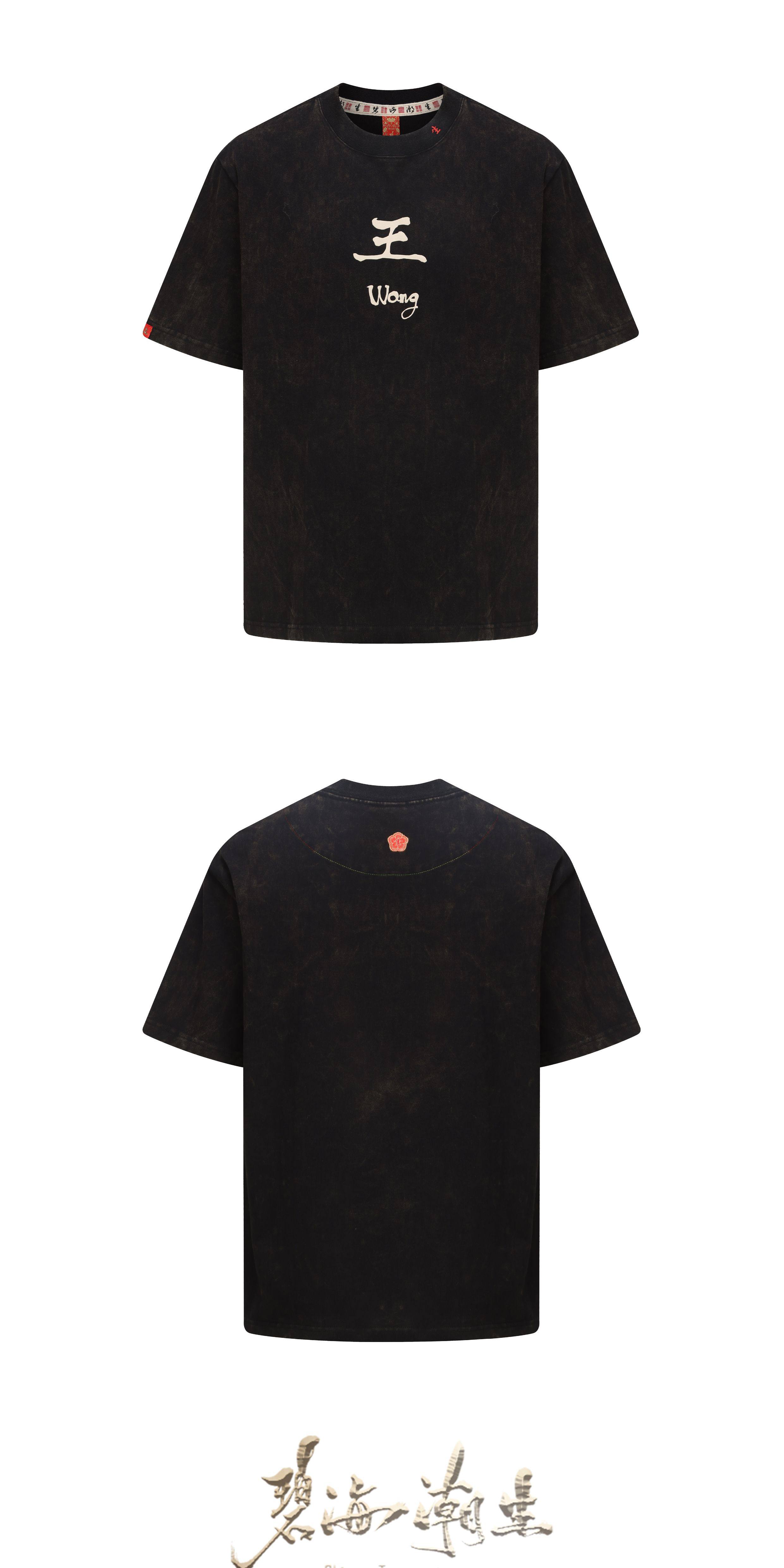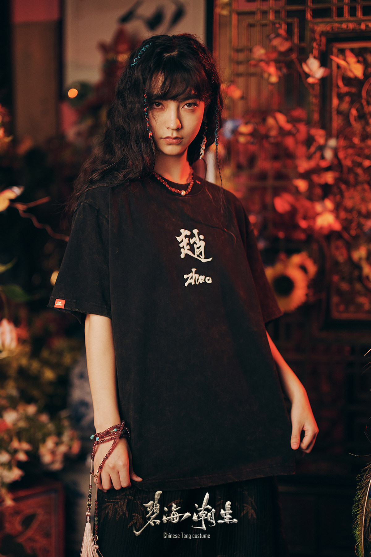 Spring and Summer New Chinese Style Pure Cotton Printed Washed Black Short-Sleeve T-Shirt with the Surname of Bi Hai Chao Sheng (碧海潮生)