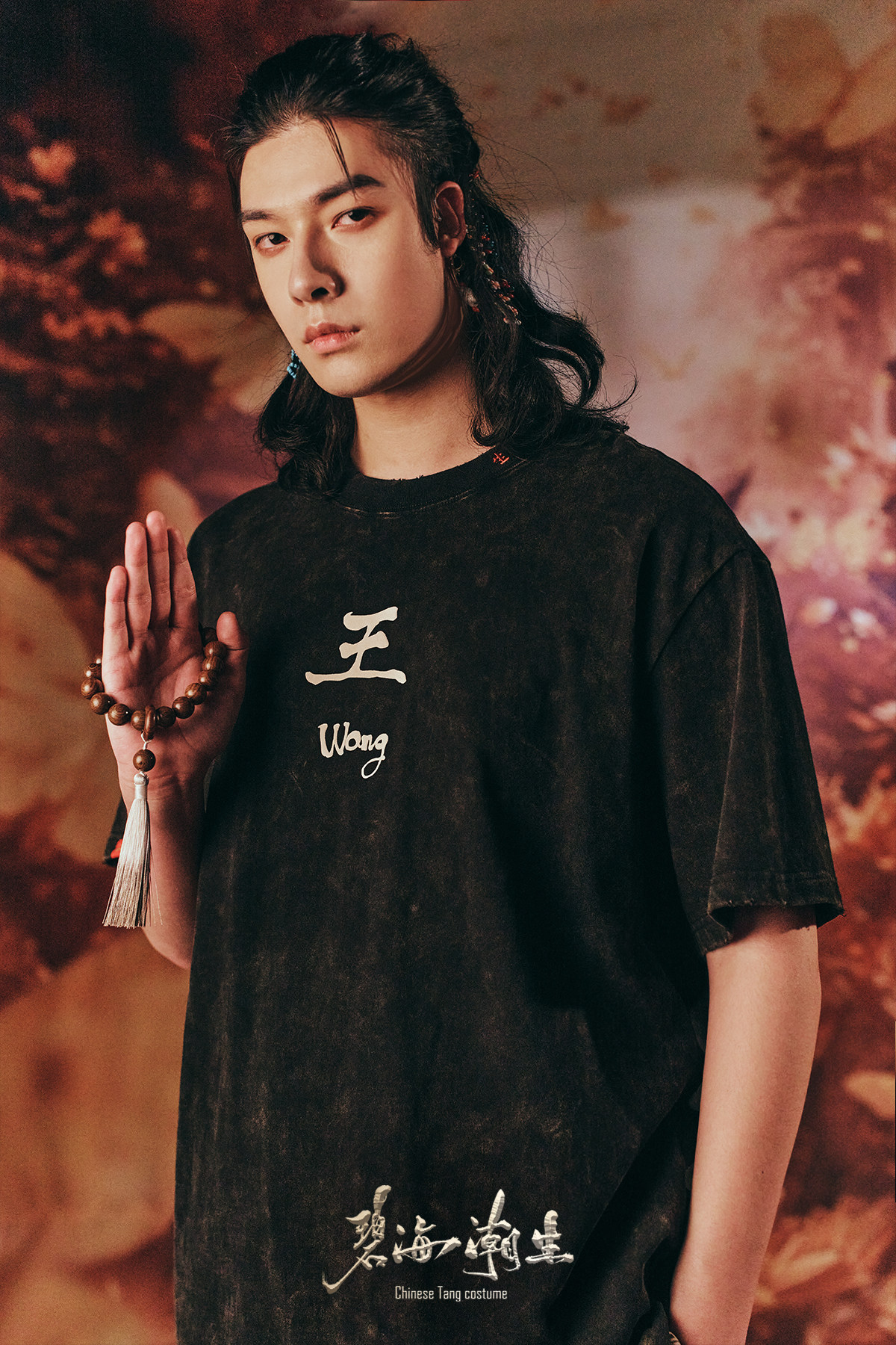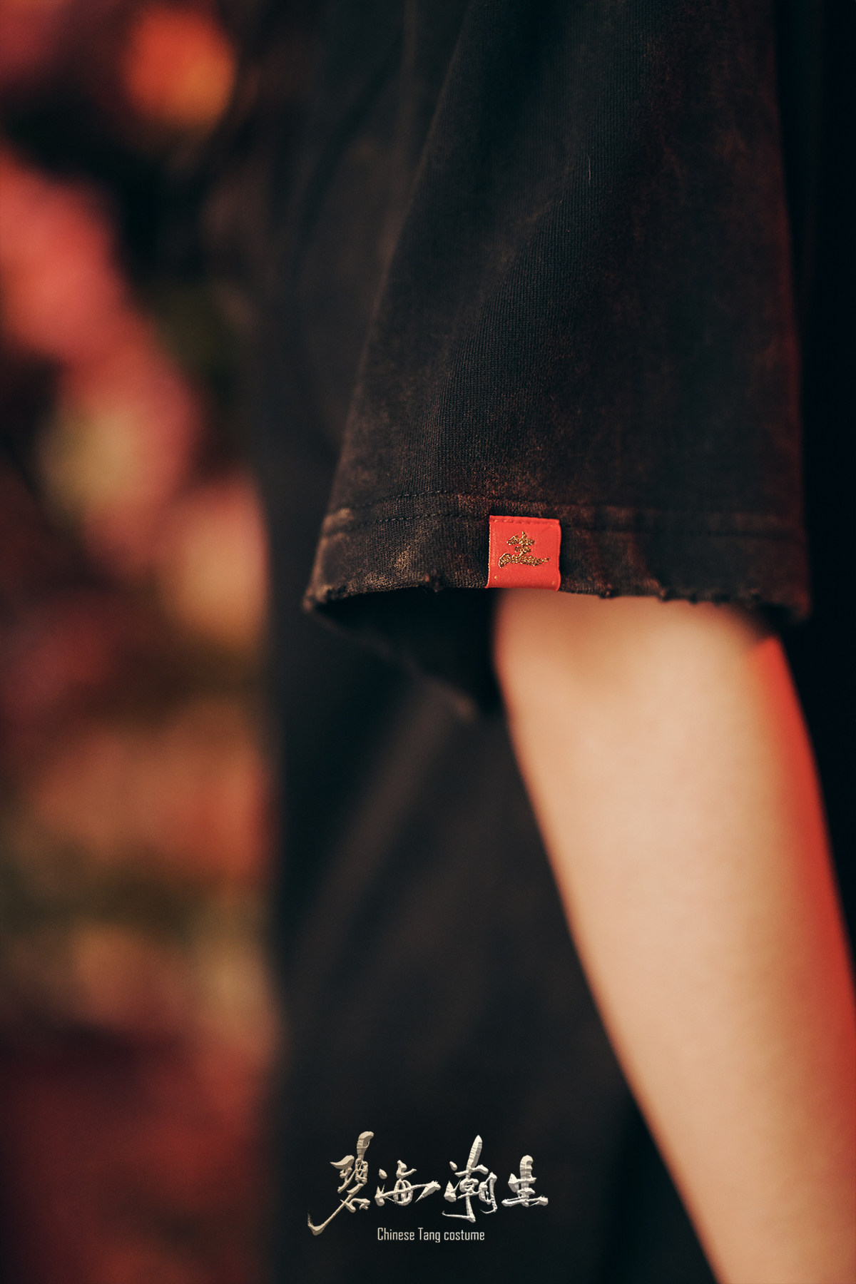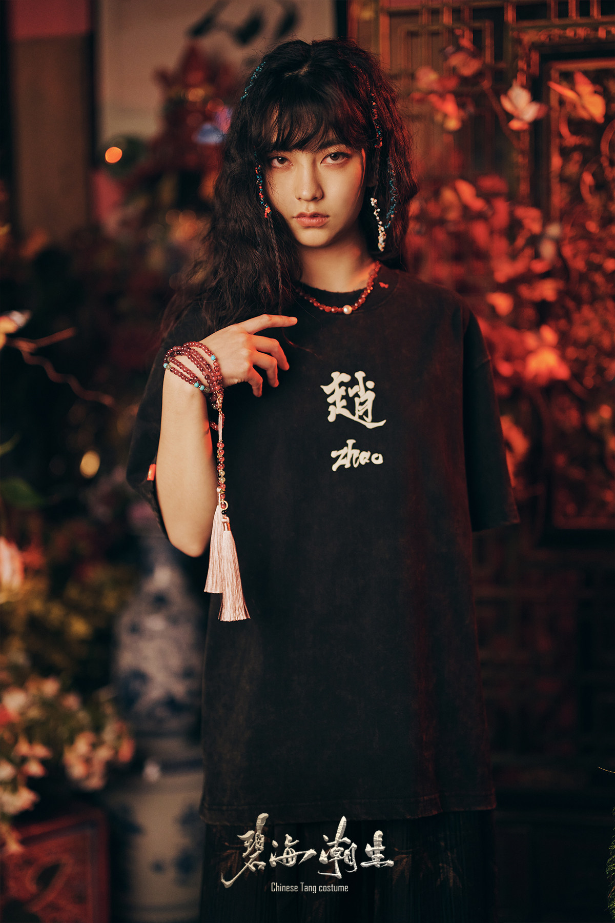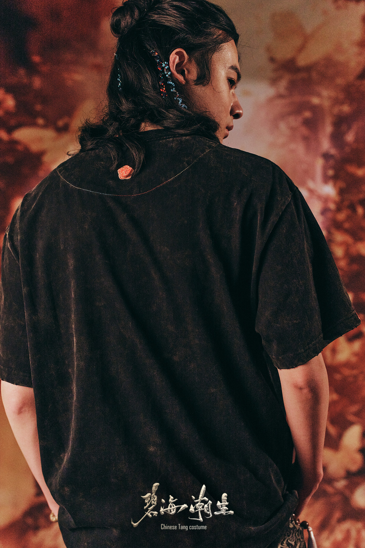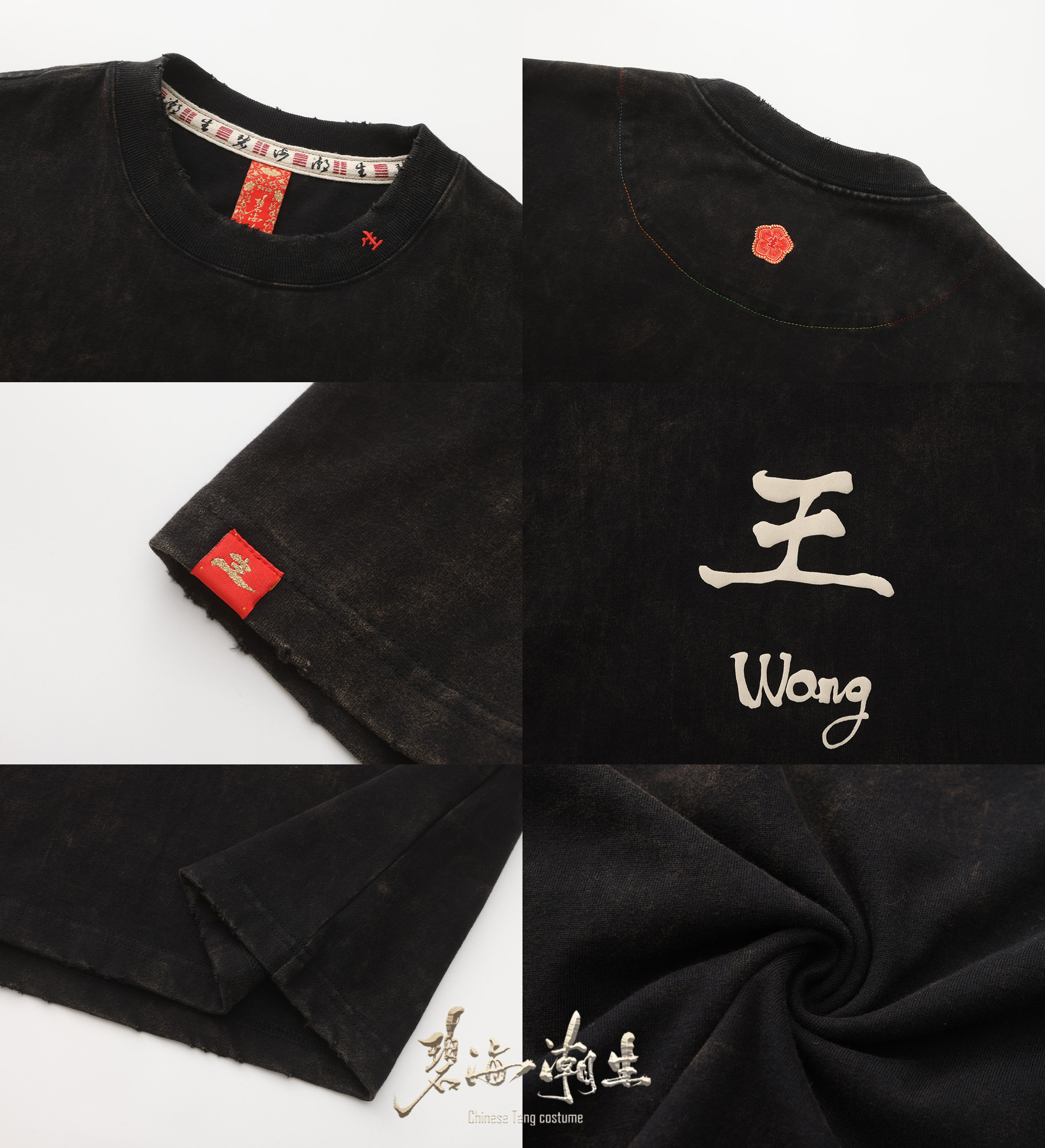 Spring and Summer New Chinese Style Pure Cotton Printed Washed Black Short-Sleeve T-Shirt with the Surname of Bi Hai Chao Sheng (碧海潮生)