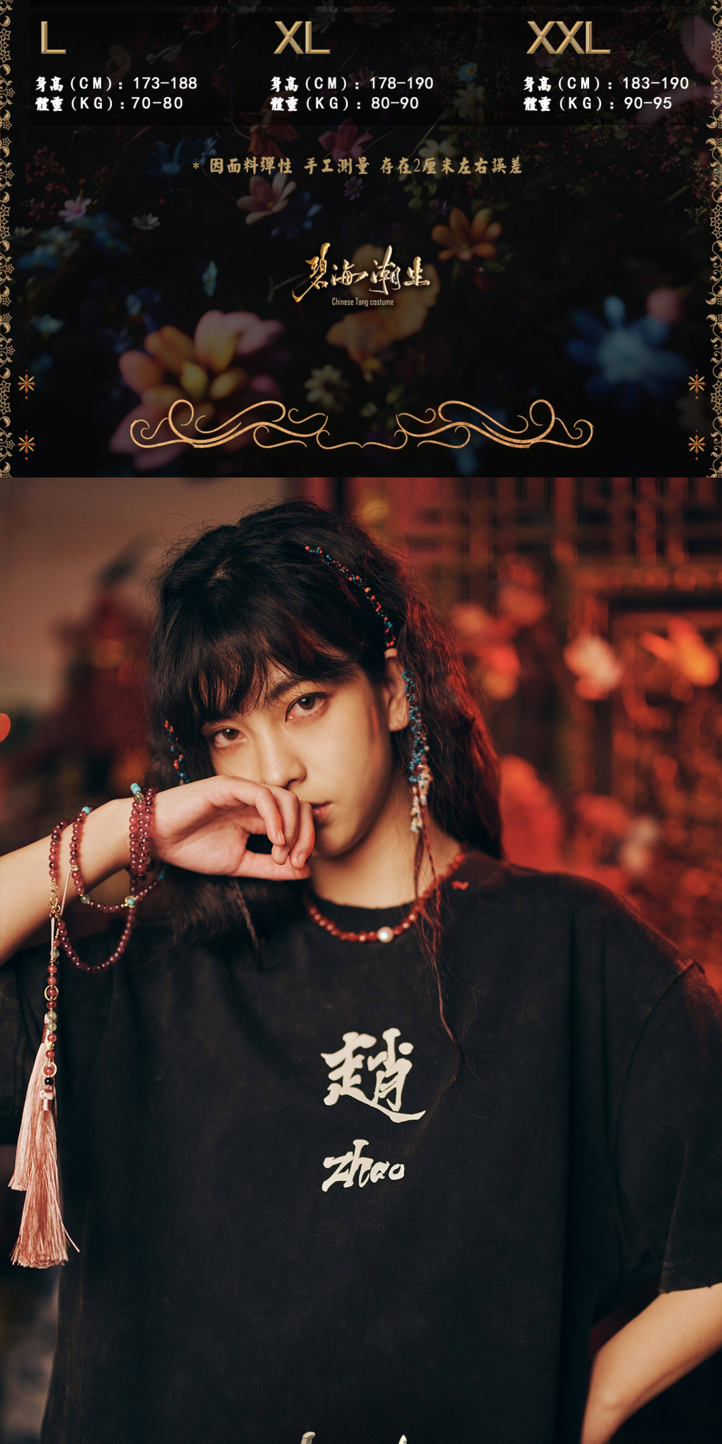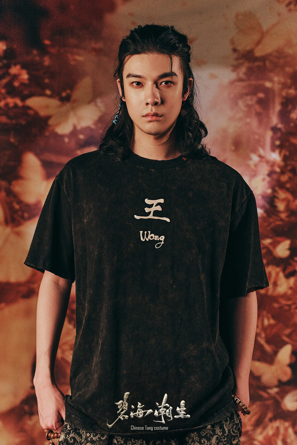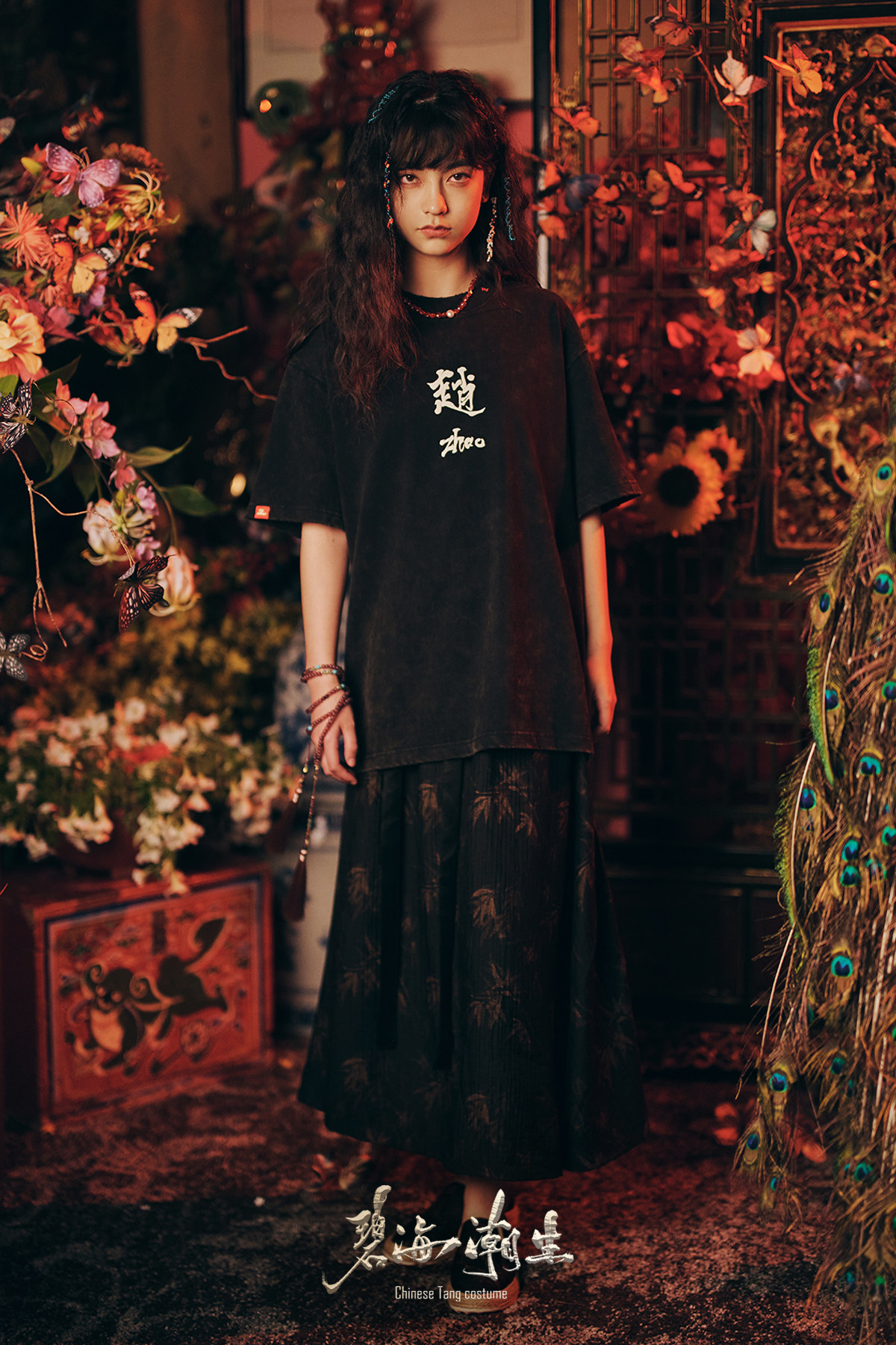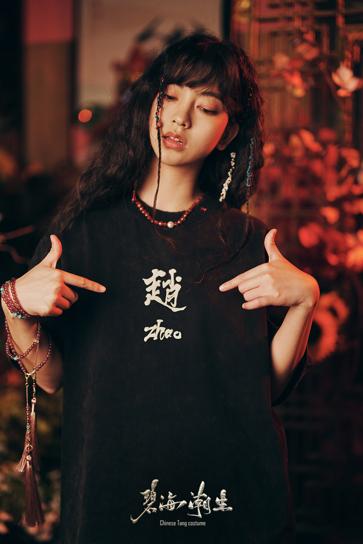 Spring and Summer New Chinese Style Pure Cotton Printed Washed Black Short-Sleeve T-Shirt with the Surname of Bi Hai Chao Sheng (碧海潮生)