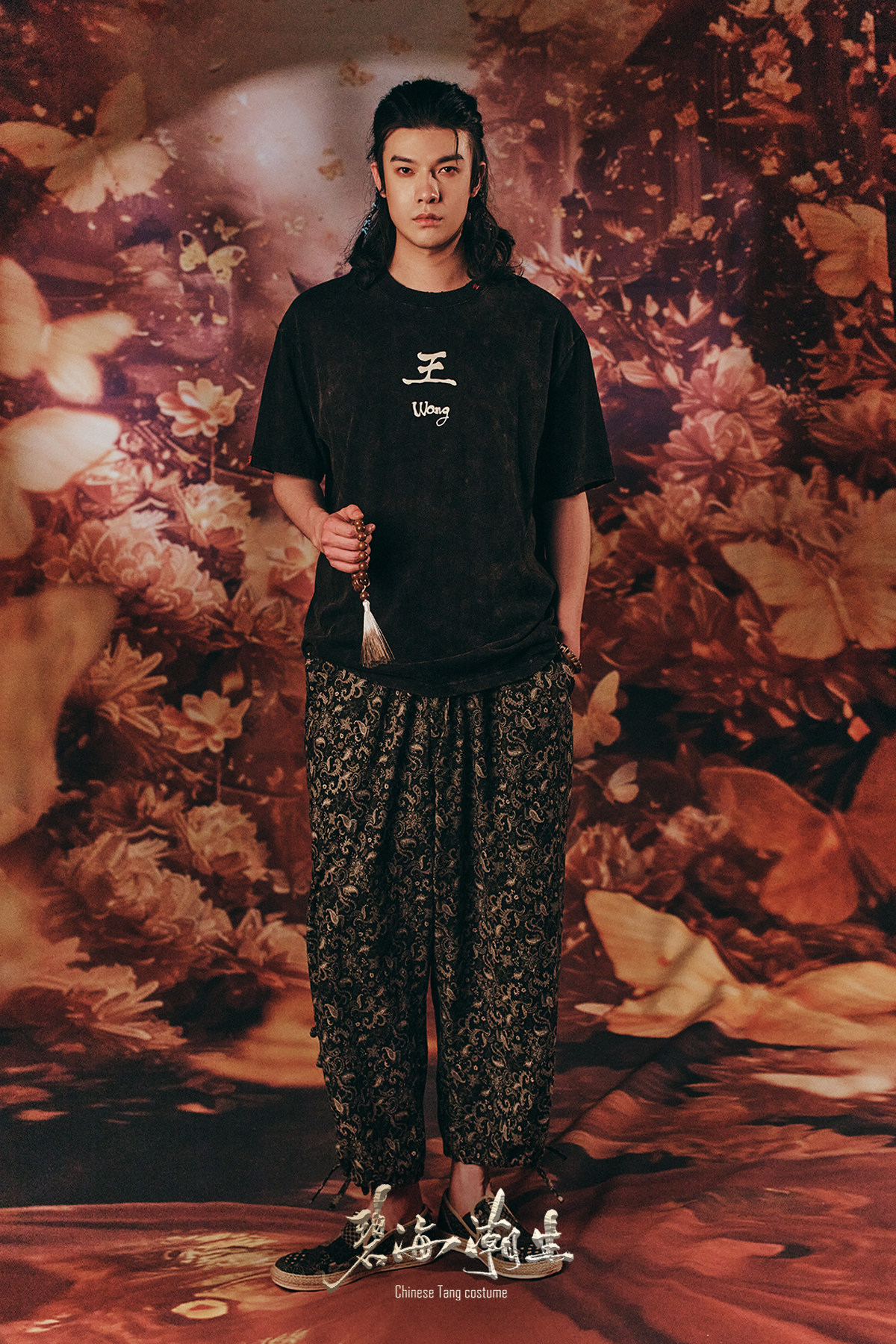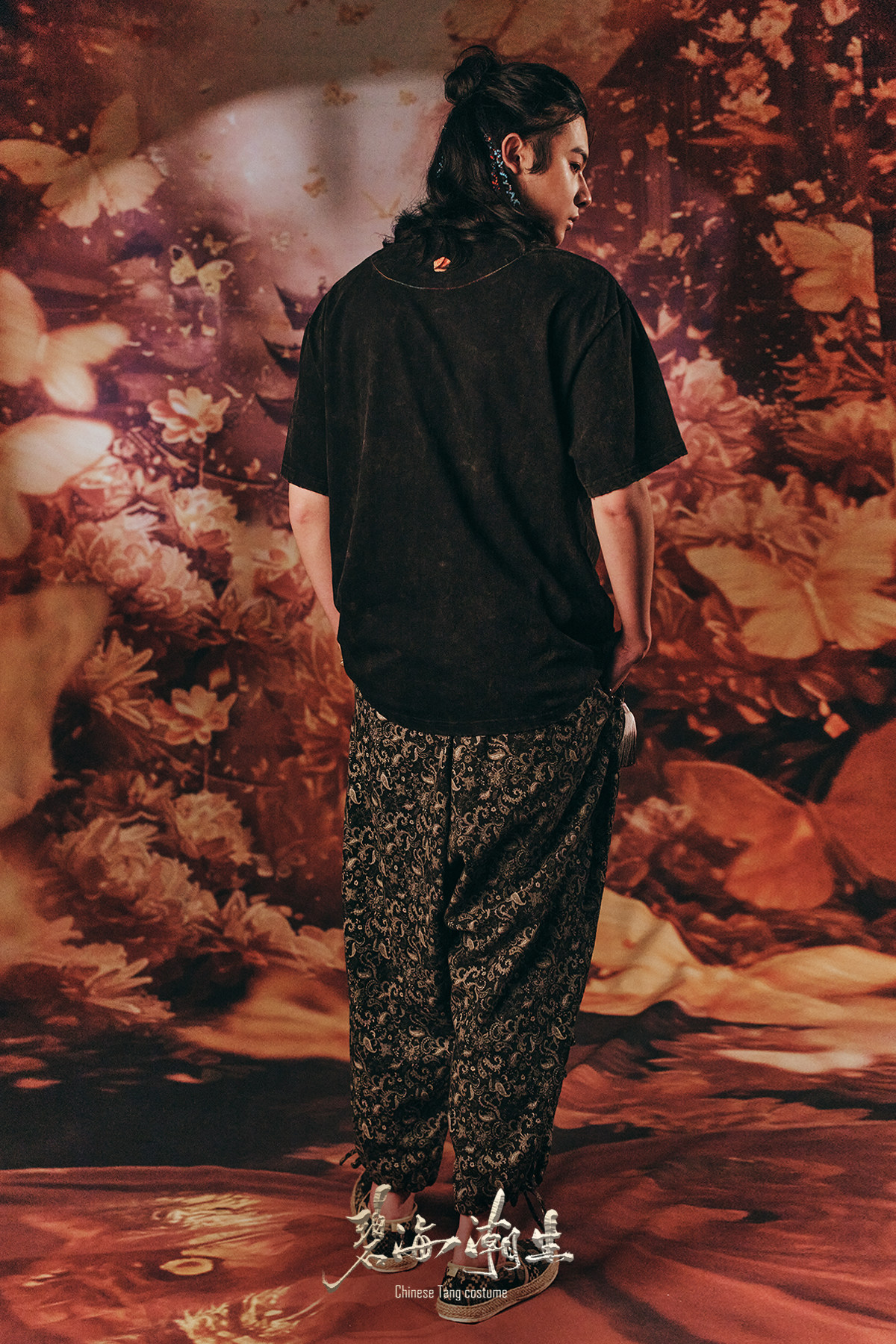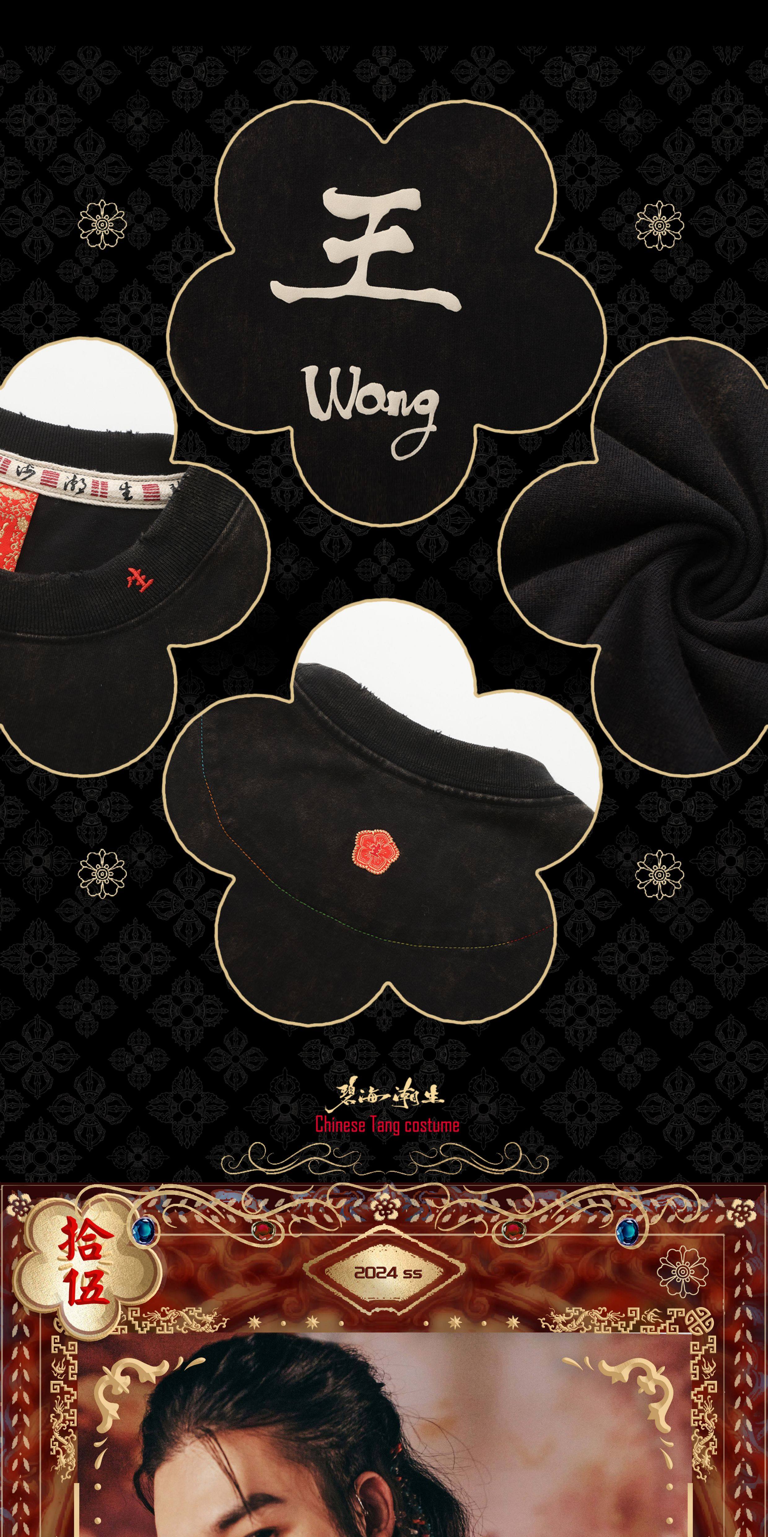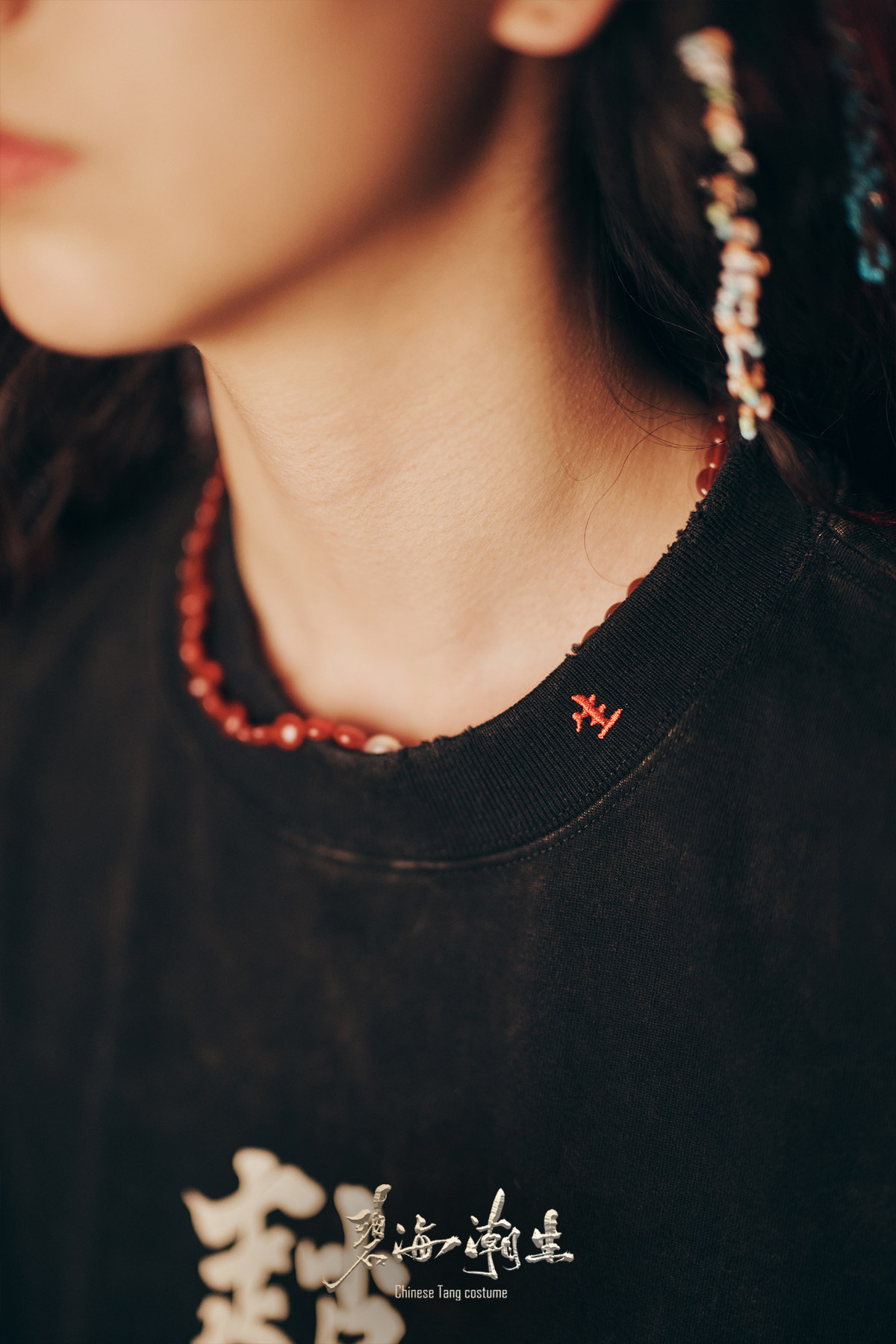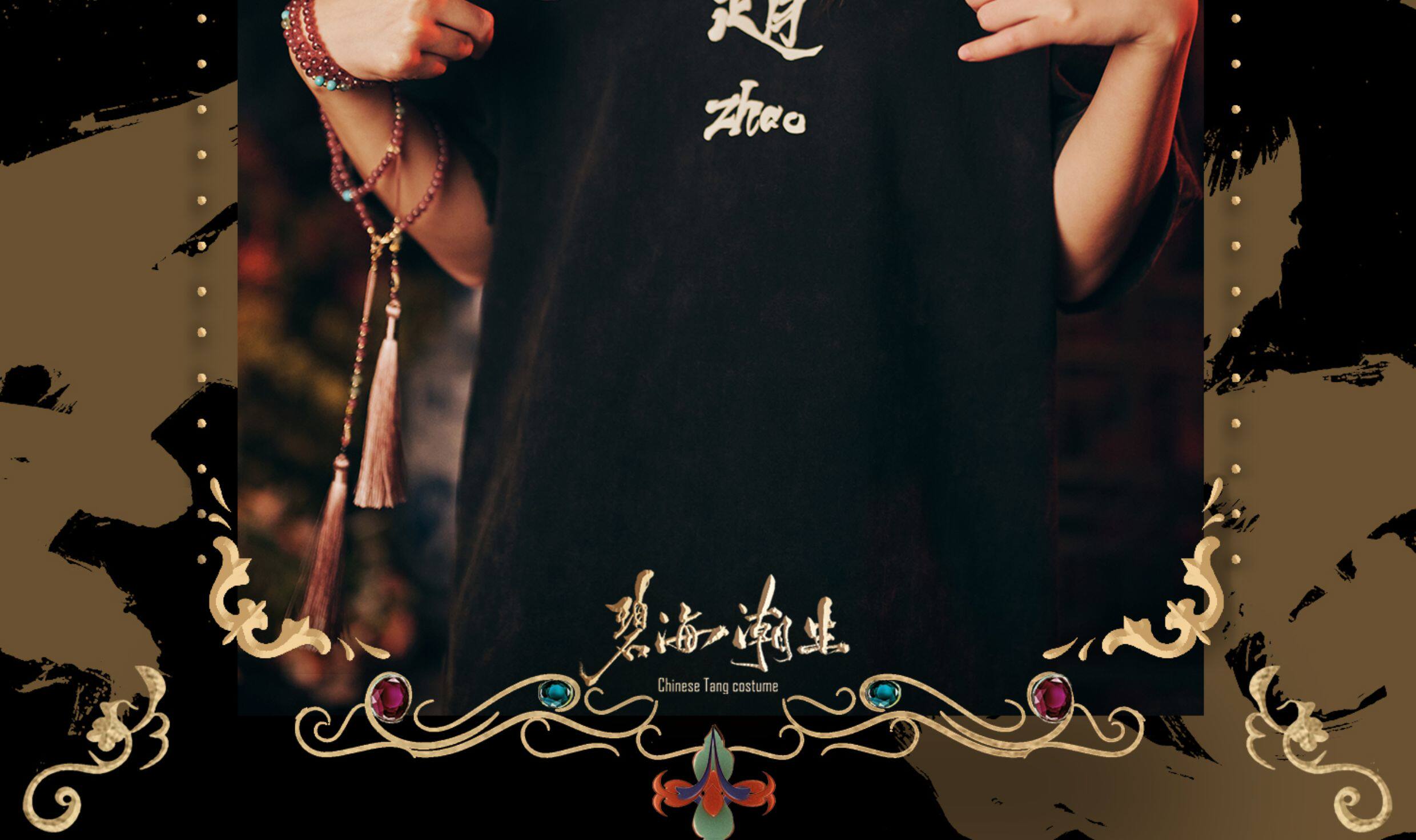 Spring and Summer New Chinese Style Pure Cotton Printed Washed Black Short-Sleeve T-Shirt with the Surname of Bi Hai Chao Sheng (碧海潮生)