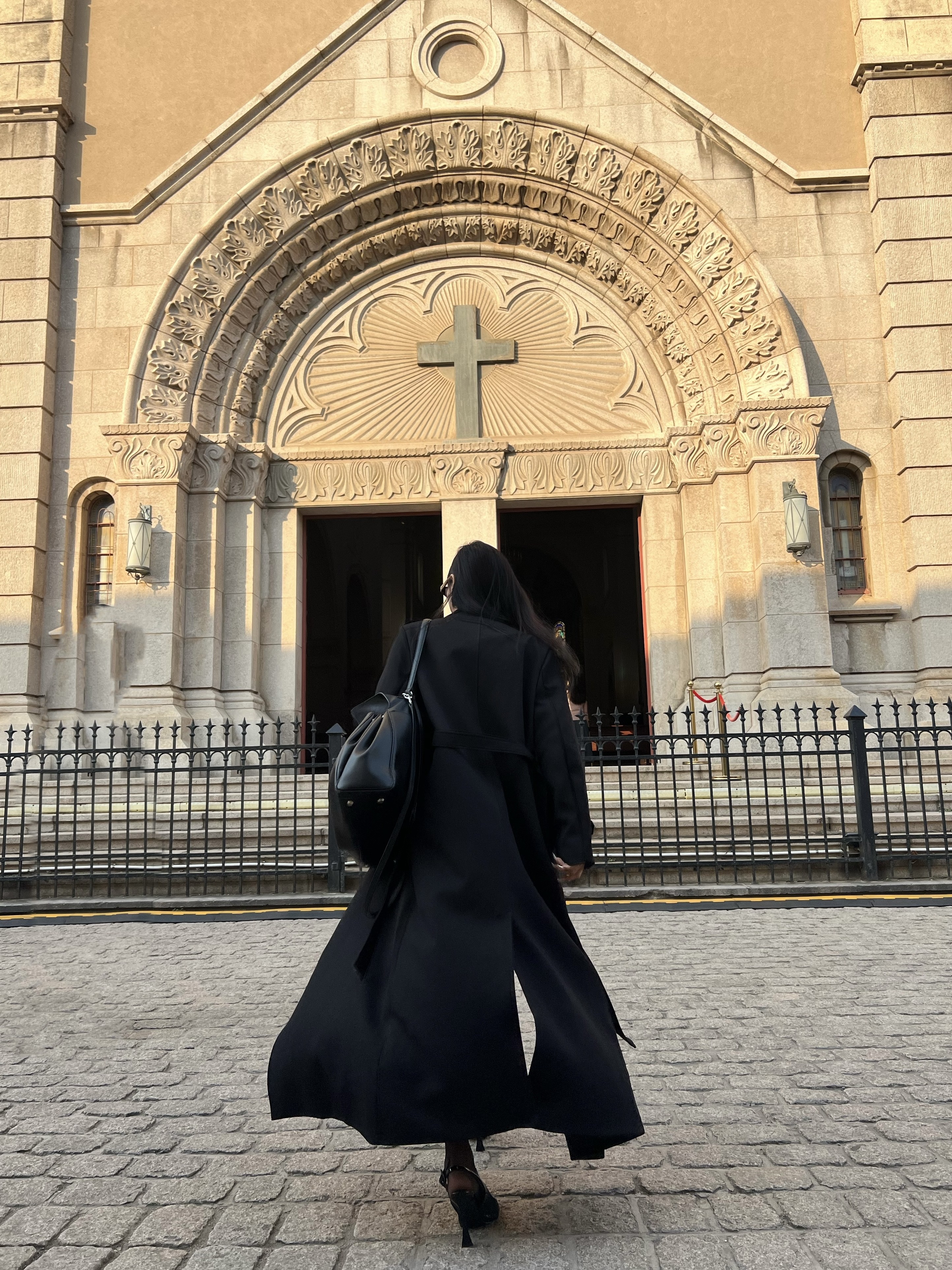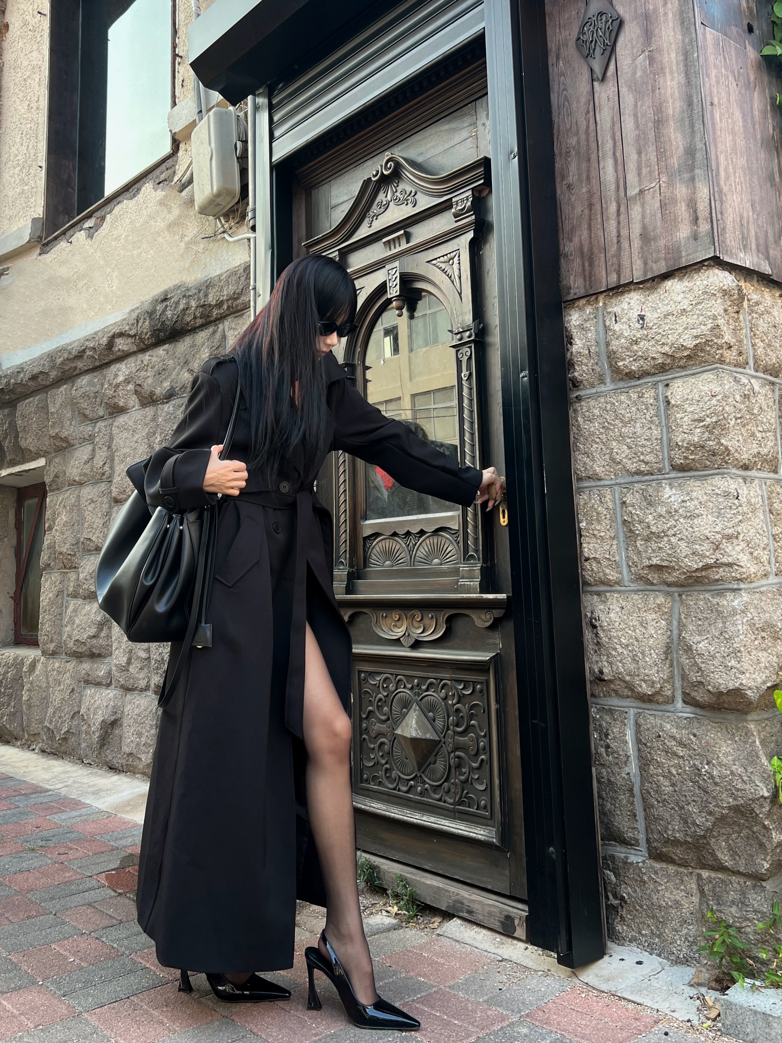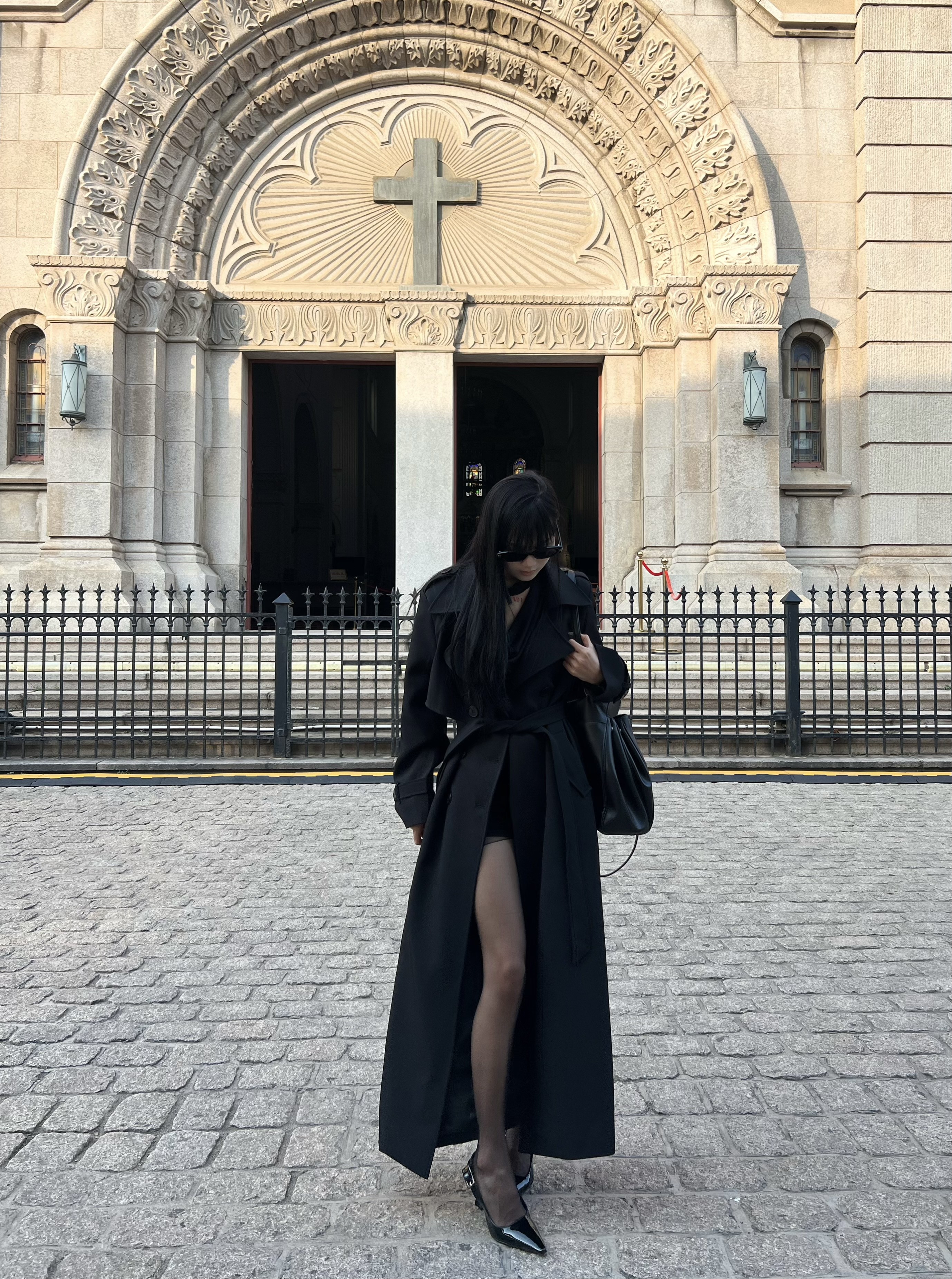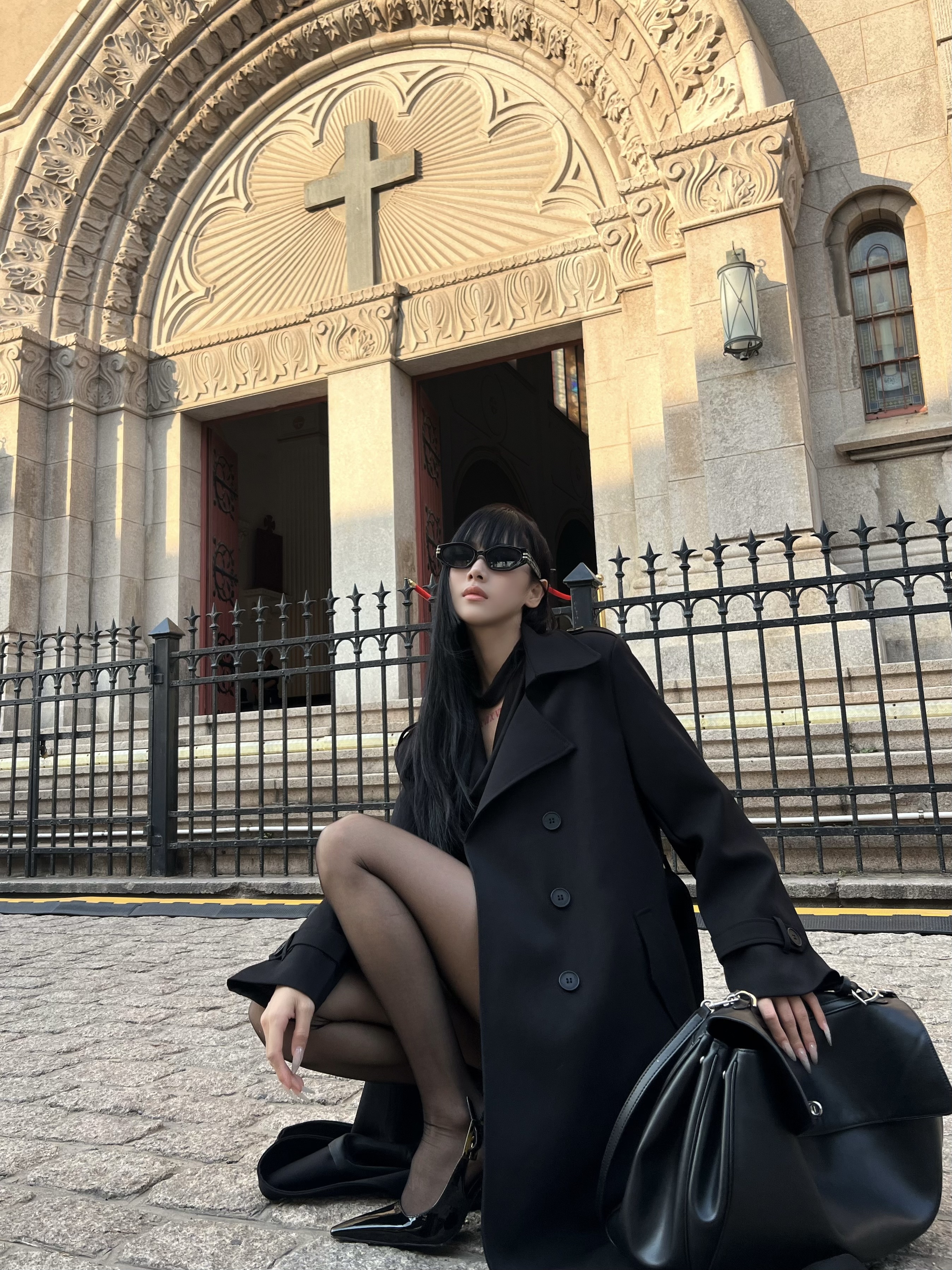 Roy11 Winter Black High-End Elegant Over-The-Knee Mid-Length Trench Coat, Trendy Waist-Cinching Casual Coat for Women