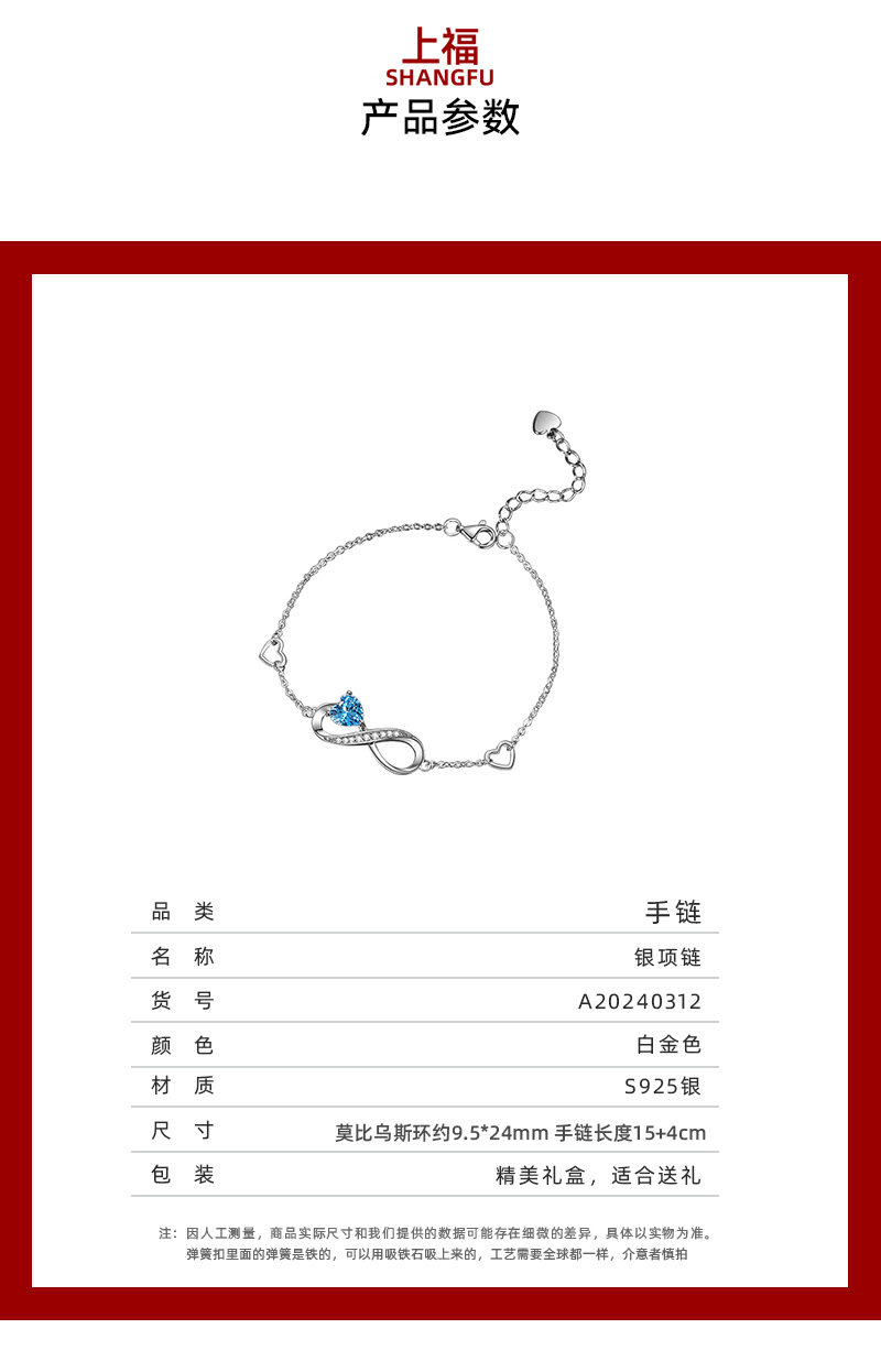 Bracelet for Women, Sterling Silver, Blue Heart-Shaped Möbius Ring, Figure-Eight Jewelry, Light Luxury, Niche, Exquisite, High-End Silver Accessory