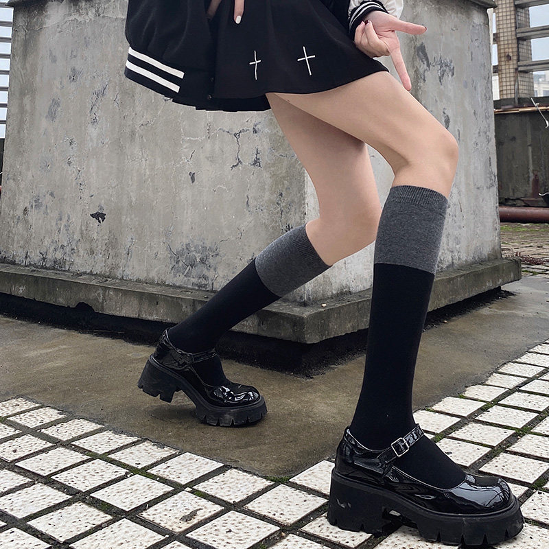 Over-The-Knee Socks for Women in Spring and Autumn, Color-Blocked Mid-Calf Socks, Black and Gray Spliced Long Thigh-High Socks for Autumn, Calf Socks