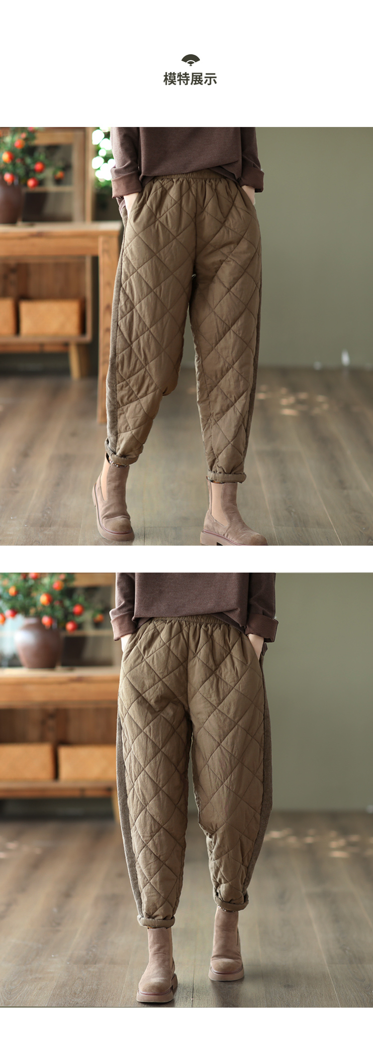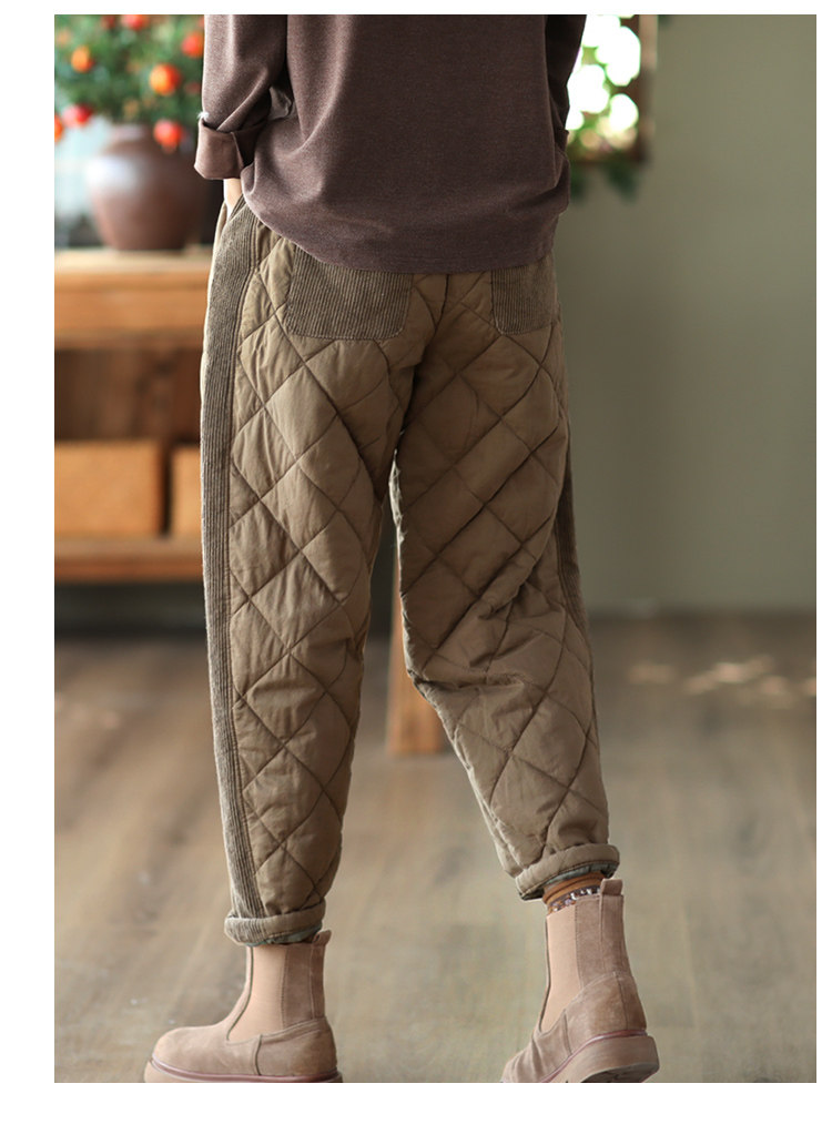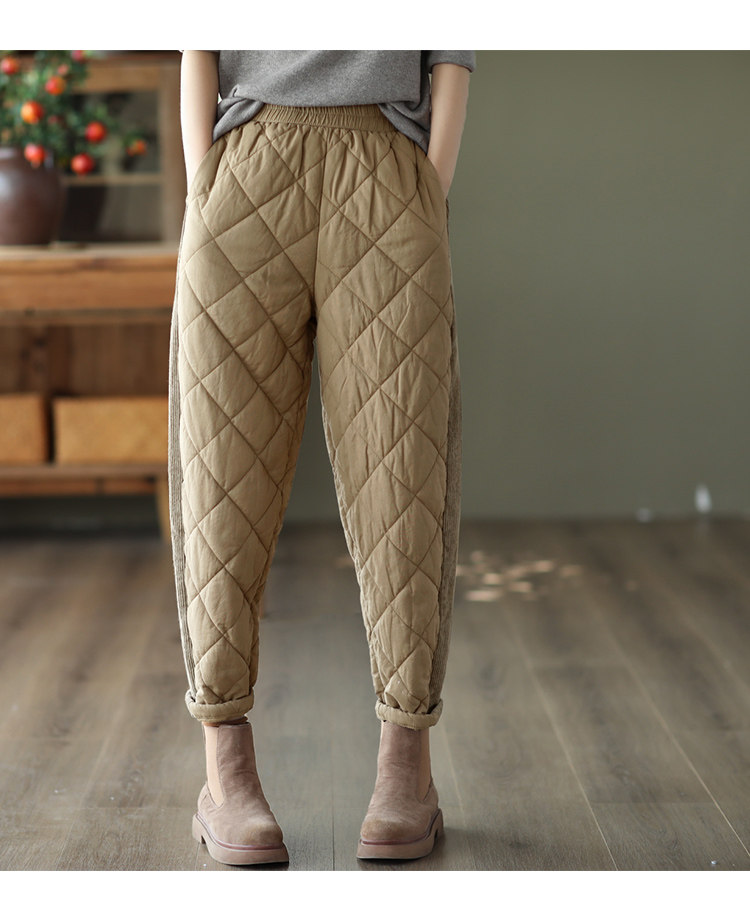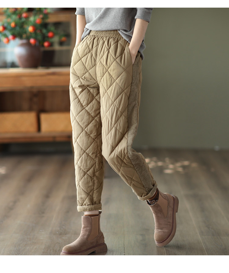 Yuanyuanmeiyi Winter Retro Patchwork Corduroy Padded Cotton Pants for Women, Elastic Waist, Quilted Thickened Harem Pants, Warm Pants