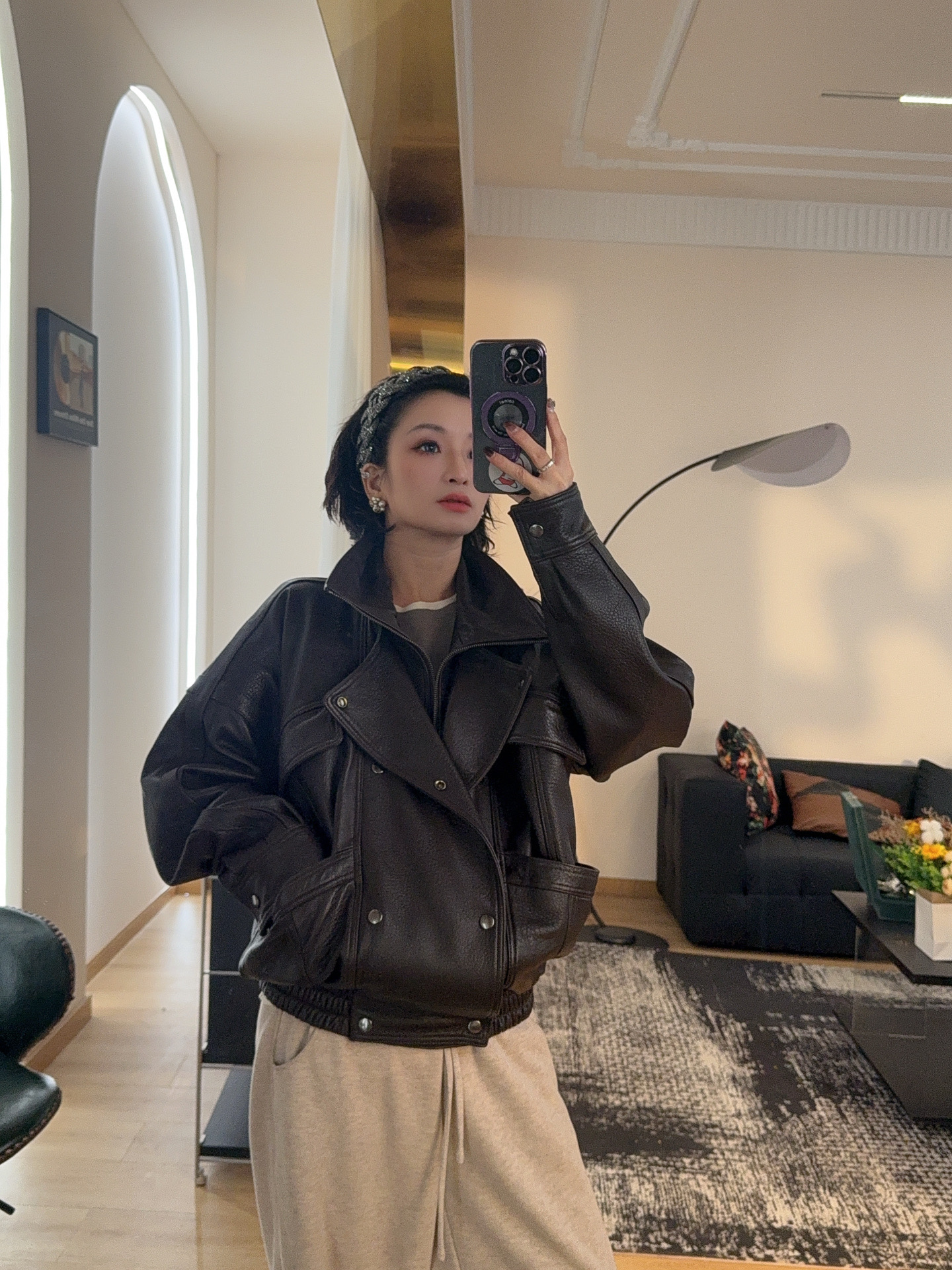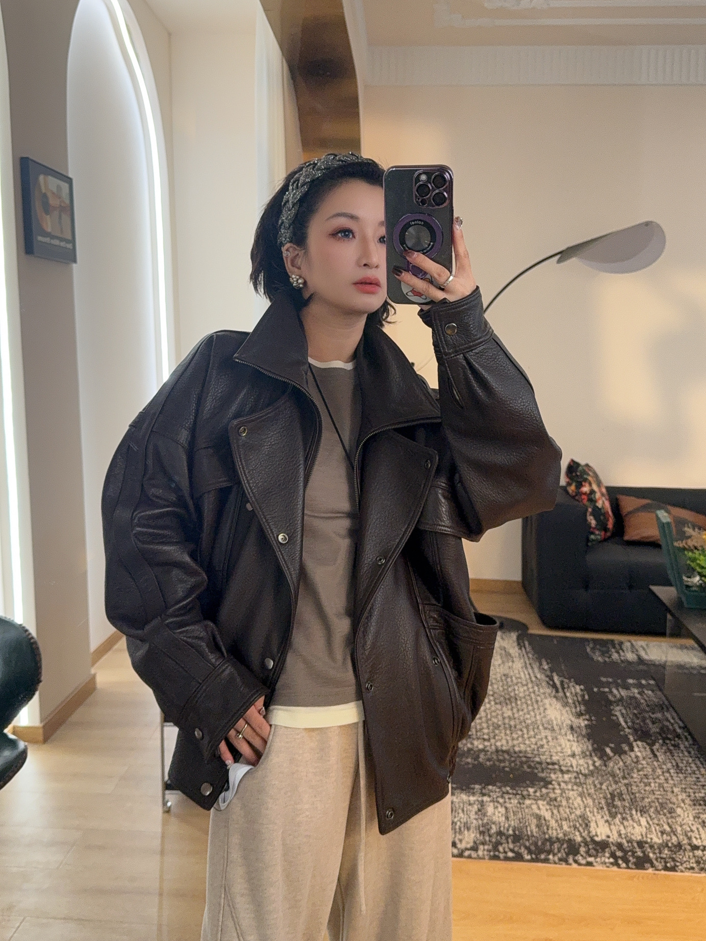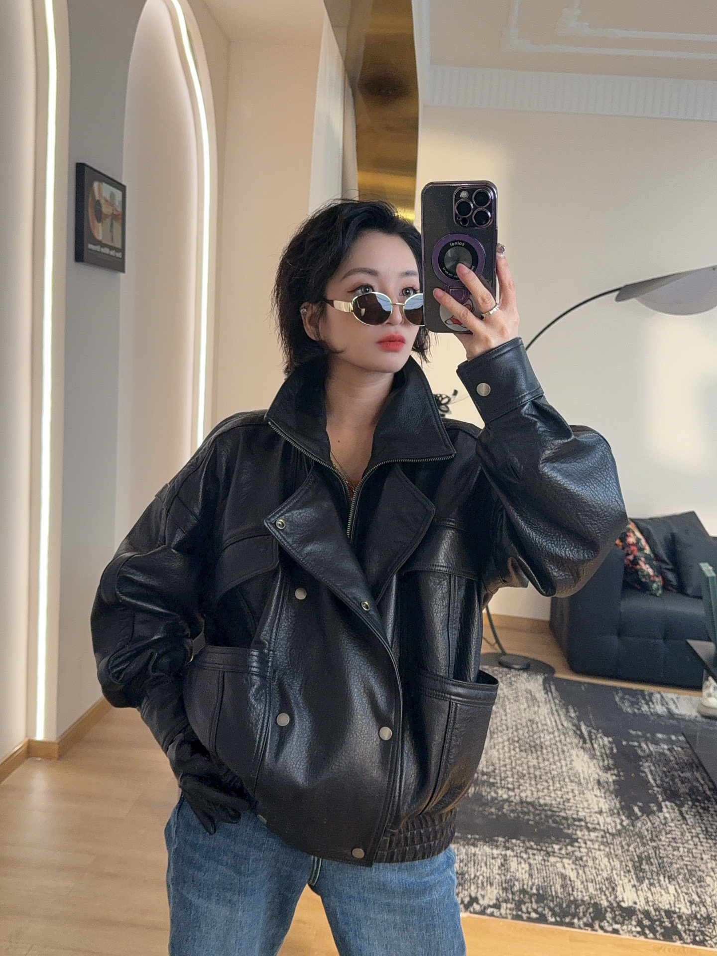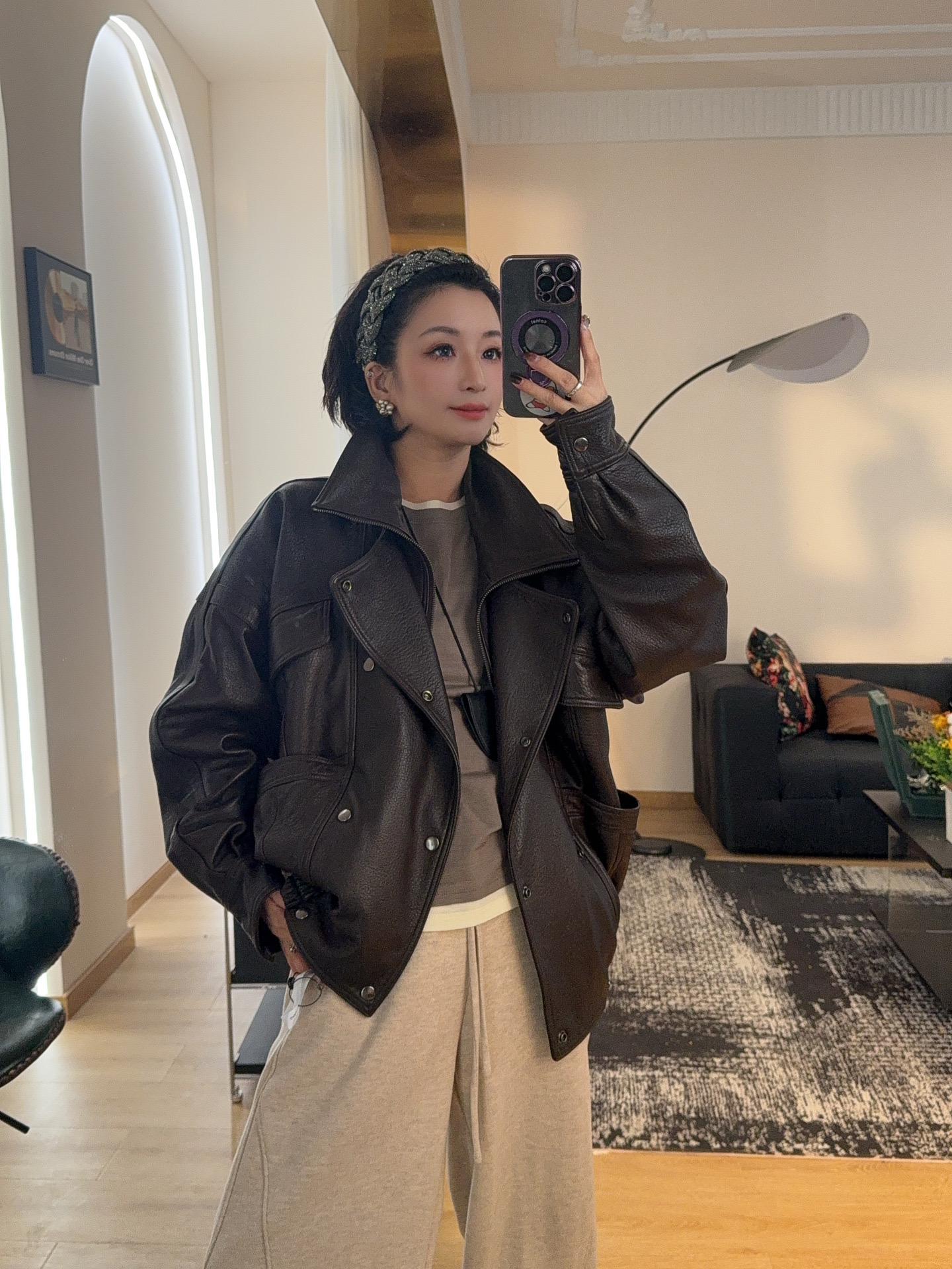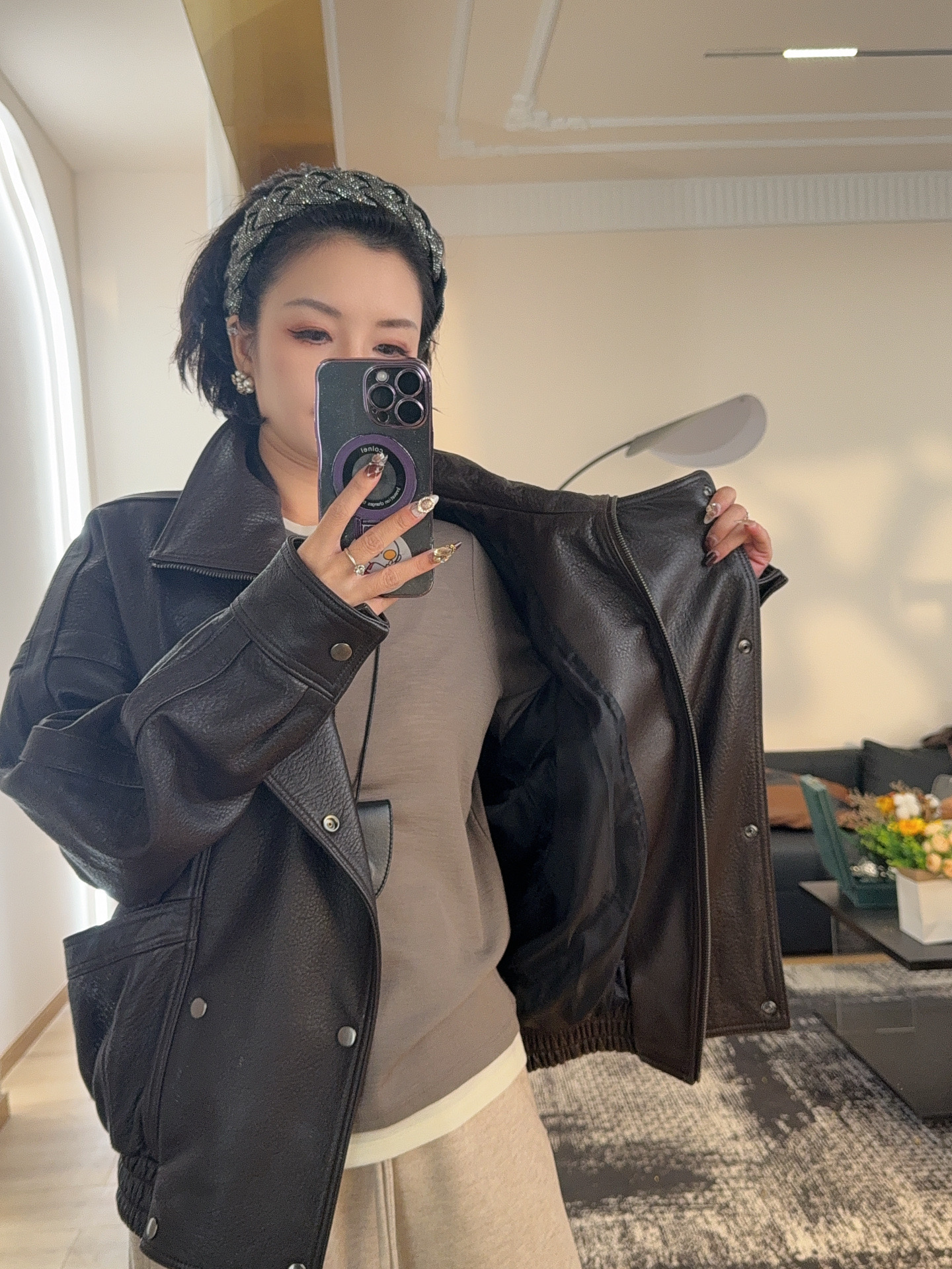 Qishi Y*L Same Source as Imported from Spain, Embossed Sheepskin Vintage Heavy-Duty Aviator Double-Collar Leather Jacket