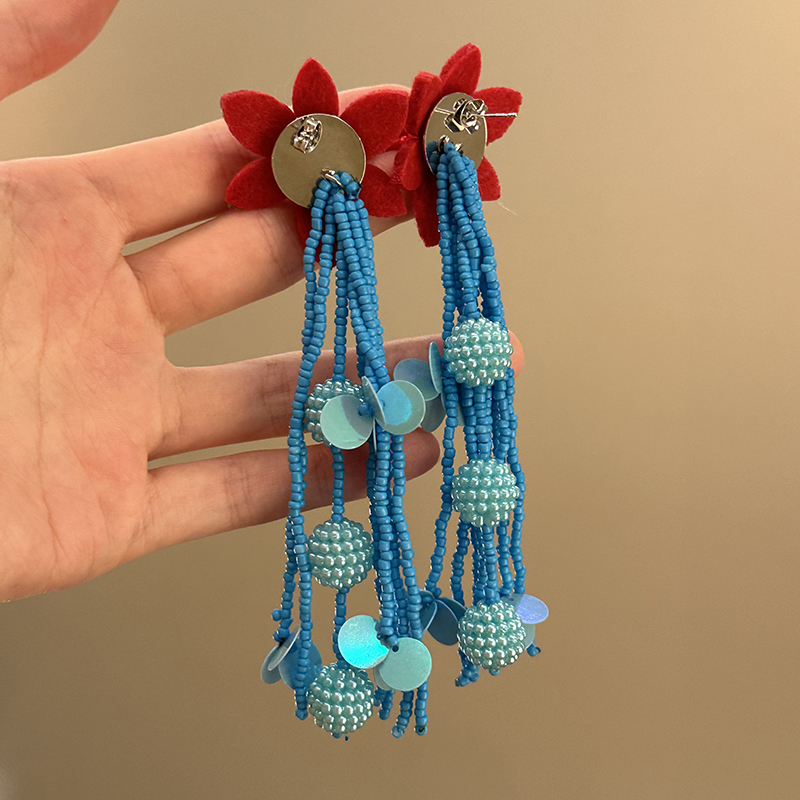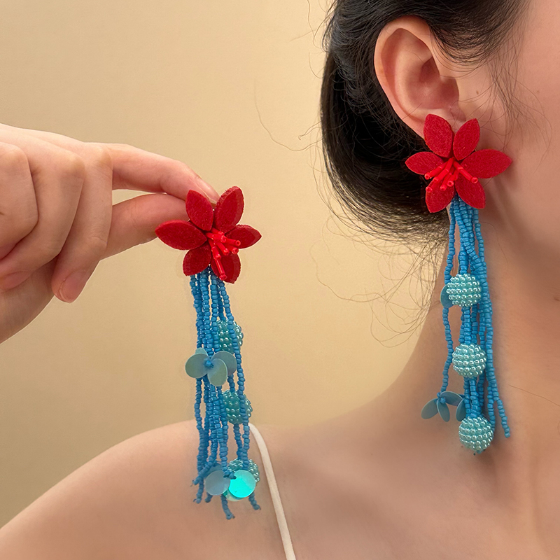 Night Whisper~ Vintage Contrasting Color Flower Beaded Tassel Earrings for Women, Holiday Style Ear Clips, Ethnic Style Earrings